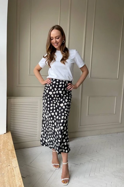 Юбка из гладкой ткани (плательный сатин),силуэт полуприлегающий, расклешенная к низу. Юбка застегивается на потайную молнию сбоку. Длина 89 см.