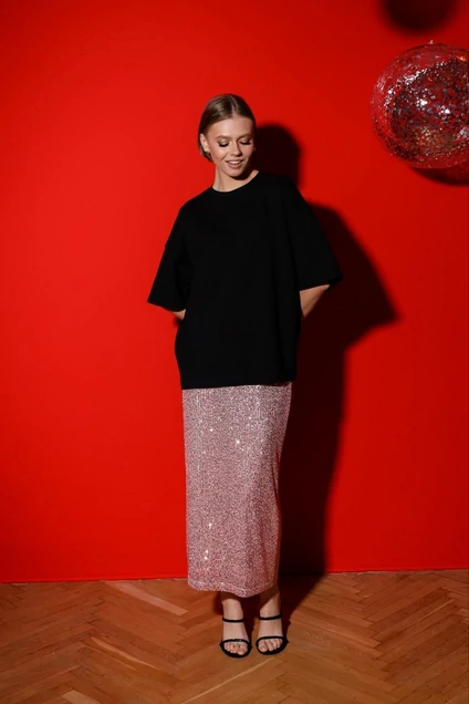 Юбка, декорированная пайетками, на подкладке. Пояс на резинке, хорошо тянется.Юбка прямого полуприлегающего силуэта