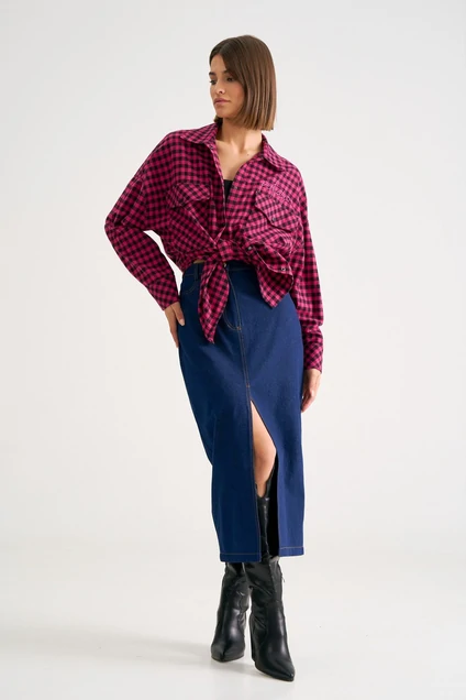Юбка из джинса с контрастной отстрочкой. С разрезом по центру. Застежка на молнию с гульфиком. Карманы с отрезным бочком. По задней части юбки - кокетка и накладные карманы.