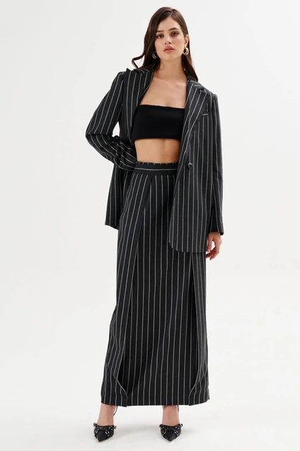 Юбка А-образного силуэта, длиной макси. По заднему полотнищу талиевые вытачки и средний шов, в котором обработан разрез и застежка на декоративную тесьму-«молнию». Переднее полотнище с отделочными деталями, которые имитируют складки. По переду, талии вставлен пояс