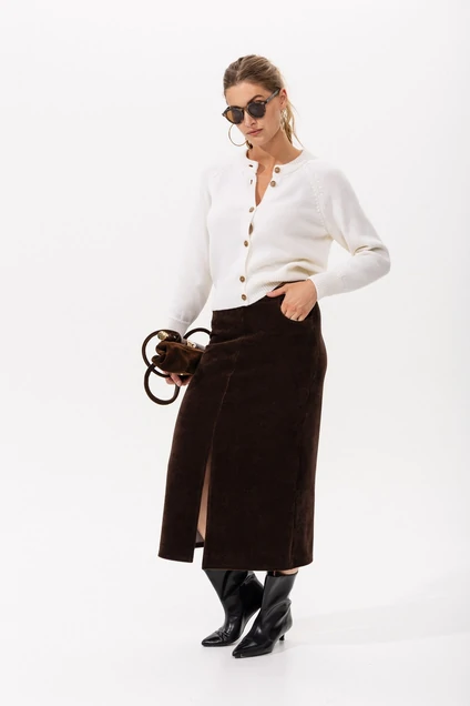 Фасон: Классическая юбка-карандаш с небольшим разрезом спереди, что придаёт ей современный и женственный вид.