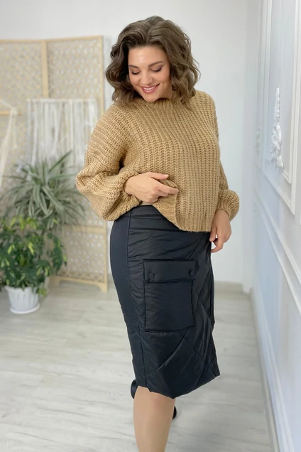 Юбка женская полуприлегающего силуэта,на стеганом синтепоне. Перед юбки с отлётной частью. На отлетной части расположен накладной карман с клапаном. Отлетная часть фиксируется на тесьму с полукольцами. Спинка юбки со средним швом и потайной молнией.