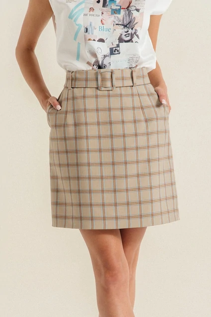 Юбка мини прямого силуэта с карманами в боковых швах. Застёжка на потайную молнию сзади. Съёмный пояс из основной ткани. Длина изделия — 47см.