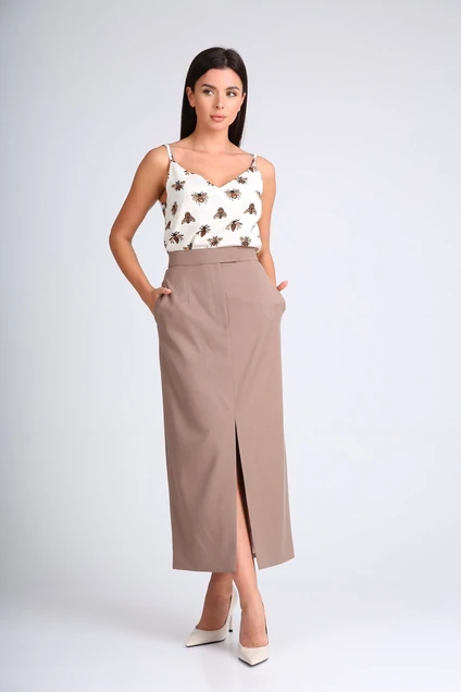 Юбка из тонкой костюмной ткани, длиной до середины икры, на подкладке. Передняя часть юбки с талиевыми вытачками, с разрезом в среднем шве с карманами, наклонными к боковым швам, с застёжкой на тесьму-молнию, обработанную гульфиком и откоском. Спинка с талиевыми вытачками, с разрезом в среднем шве. Пояс со сгибом по верхнему краю, по центру переда застёжка пояса на два потайных крючка и потайную пуговицу, в пояс, от боковых швов до вытачек по спинке, втянута эластичная тесьма, для лучшего прилегания.
