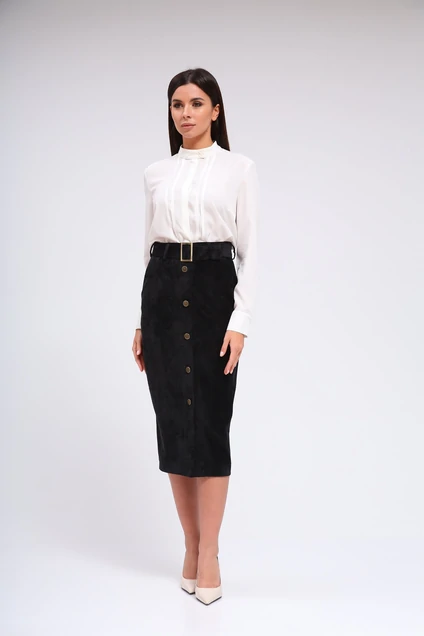 Юбка заужена книзу, длиной миди, на притачном поясе. Спереди застежка на металлические пуговицы. Карманы боковые с наклонным входом. Сзади в среднем шве застежка на декоративную металлическую молнию. В комплект входит съемный пояс с пряжкой.