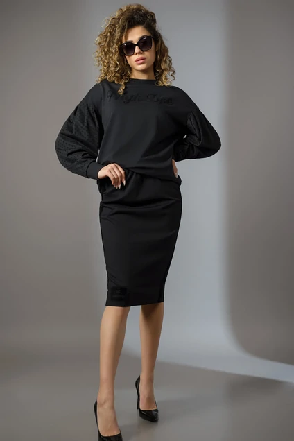 Юбка прямая типа «карандаш». По поясу резинка, на боковых швах лапмпасы из бархатной тесьмы. В боковых швах карманы. По низу и переду- декоративная печать. На фото представлен джемпер М7167-1. Длина юбки - 71 см.