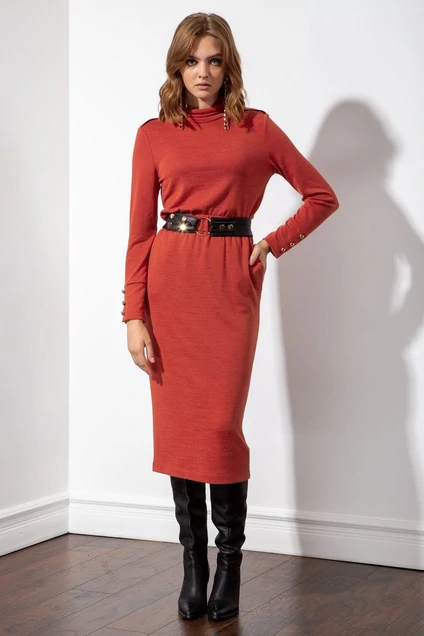 Трикотажная юбка на поясе с резинкой прямого силуэта. Обработаны наклонные боковые карманы. Юбка на подкладке. В дополнение широкий пояс из экокожи, декорированный металлическими кнопками и кольцом, сзади на резинке.