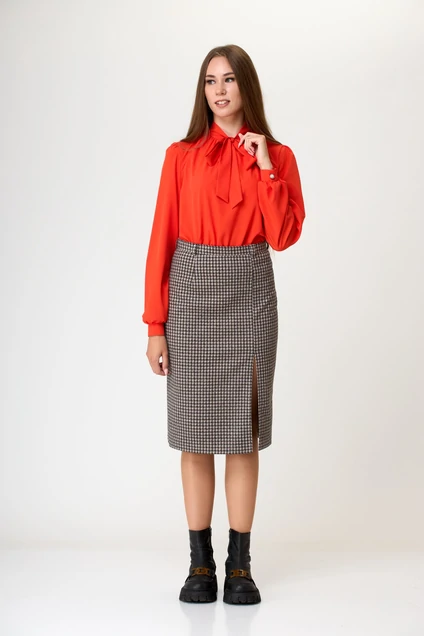 Стильная юбка, длинной ниже колена, с разрезом спереди. По спинке юбки застежка на потайную молнию и пуговицу.