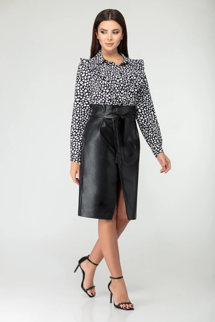 Юбка женская с завышенной талией из экокожи без подкладки. По переду фигурный подрез, имитирующий запах юбки. Задняя часть юбки с вытачками. По линии талии переда и спинки зафиксированы складки, цельнокроеные с юбкой. Верхний срез юбки обработан цельнокроеной обтачкой. По линии талии шлёвки, дополнительно фиксируют складки, в них заправляется съёмный пояс шириной 3,5 см. В левом боковом шве застёжка на потайную тесьму молнию.