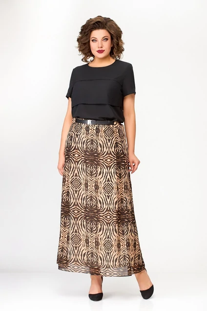 Юбка А-силуэта, длиной “миди” на подкладке. Юбка выполнена из струящейся шифоновой ткани. Перед и спинка юбки цельнокроеные с четырьмя складками по талии. В боковом шве обработана потайная молния. Верх юбки обработан притачным поясом с регулировочной резинкой по спинке. Пояс застёгивается на петлю и пуговицу.