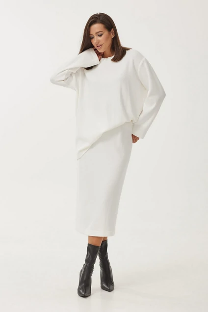 Юбка прямого силуэта, длиной миди, выполнена из мягкого трикотажного полотна. Пояс с резинкой шириной 4 см. По заднему полотнищу средний шов, внизу которого оформлен разрез. Длина изделия по боковому шву 78 см.