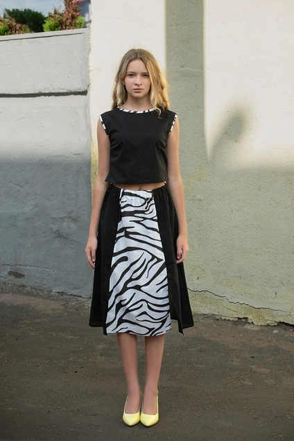 Юбка миди черного цвета.Вставка белого цвета с принтом Зебра.Разрещв на коленках.Талия на резинке.