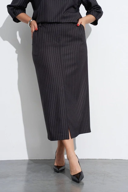 Юбка прямого силуэта. Спереди и сзади обработаны средние швы со шлицами в низу. На передних полотнищах обработаны карманы с косым входом и застёжка на молнию. Верх юбки на притачном поясе со шлёвками и эластичной тесьмой. Изделие на подкладке.