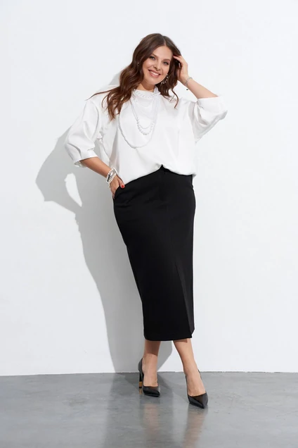 Юбка прямого силуэта. Спереди обработан средний шов со шлицей в низу. На передних полотнищах обработаны карманы с косым входом и застёжка на молнию. Верх юбки на притачном поясе со шлёвками и эластичной тесьмой. Изделие на подкладке.