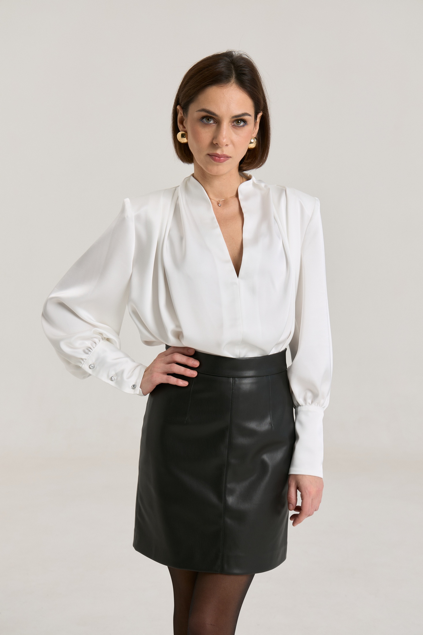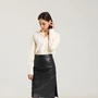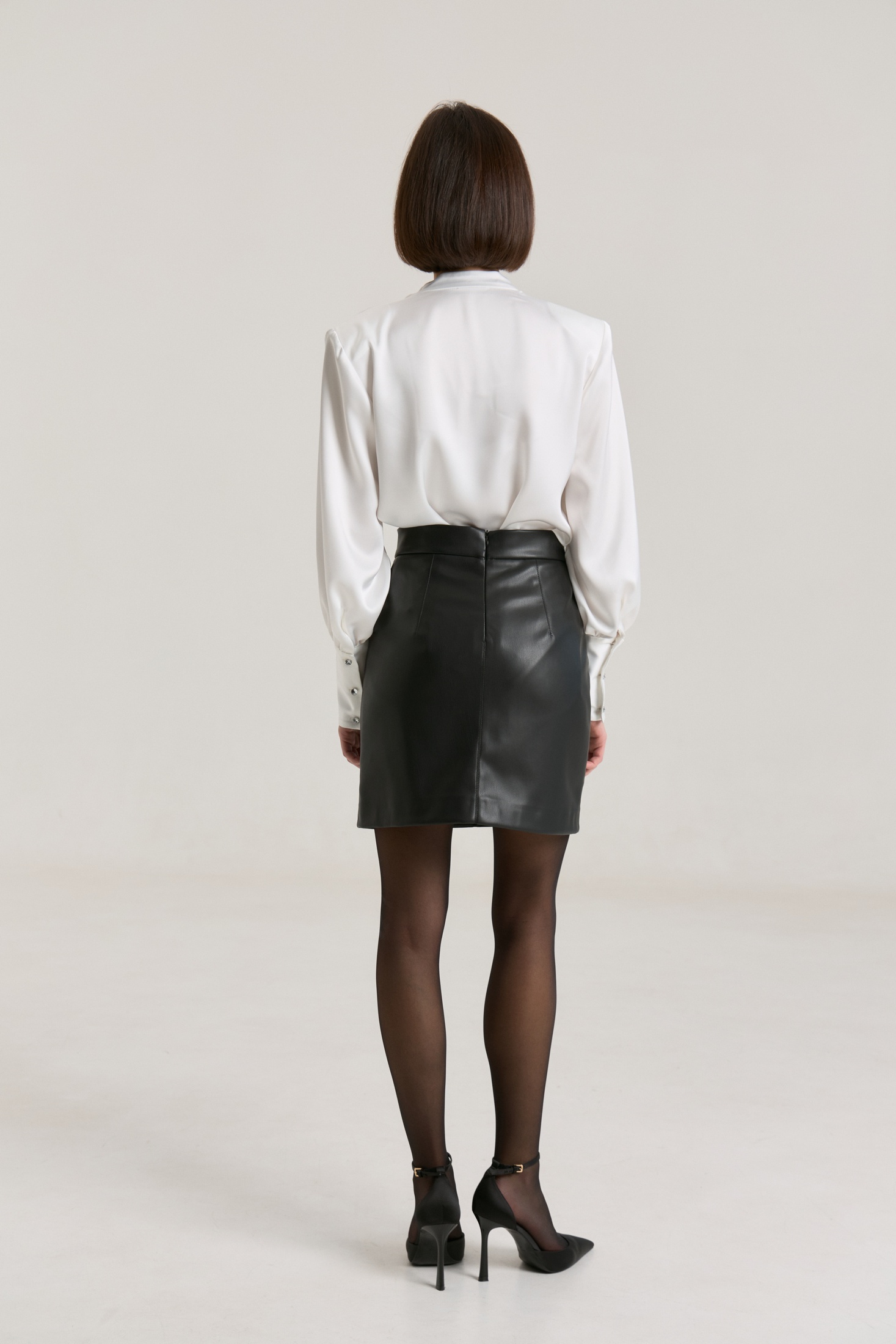 Юбка прилегающего силуэта на притачном поясе, посадка высокая , юбка на подкладке, изделие имеет центральный шов спереди и сзади. В среднем шве застежка на потайную молнию. Юбка выполнена из мягкой экокожи, Длина изделия 46 cм, полуобхват талии в 42-м размере 34 см.Рост модели на фото 168 см.