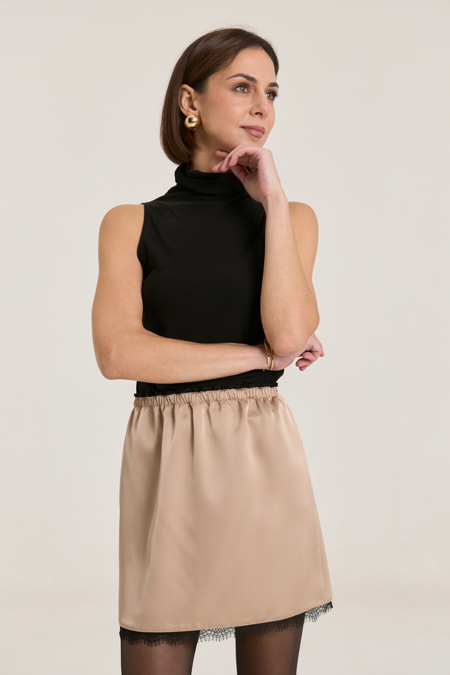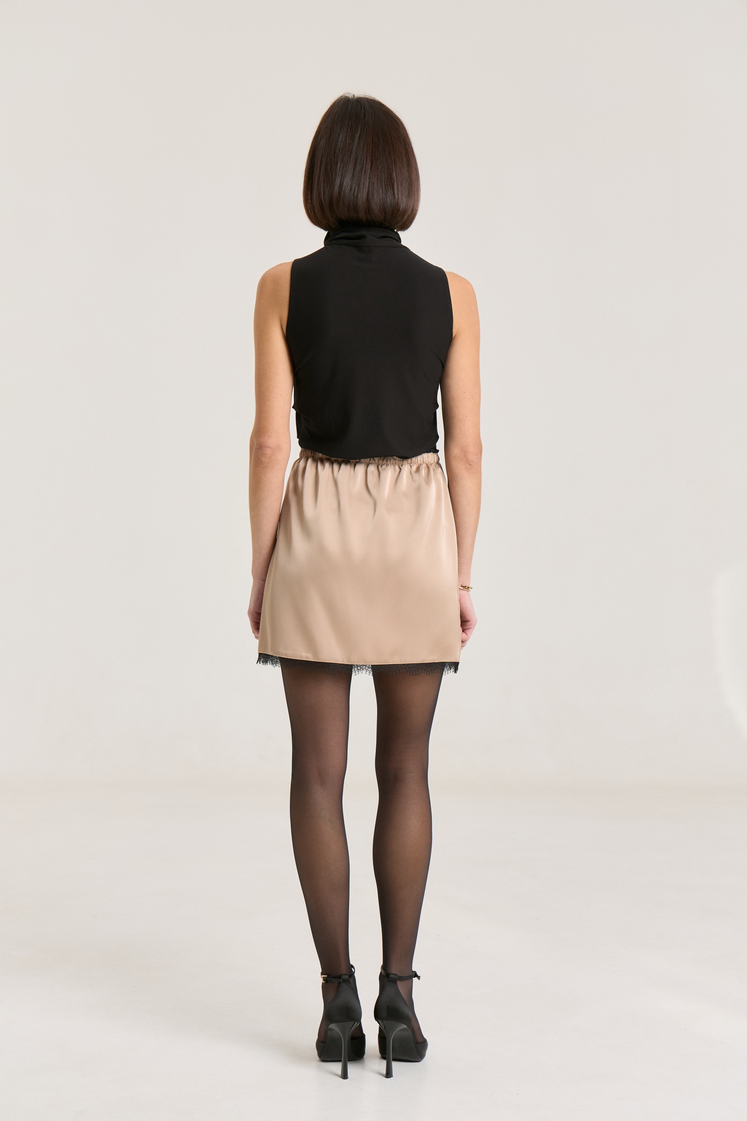 Атласная мини-юбка прямого кроя, на резинке, по низу кружево, пояс обработан декаративной тесьмой. Атлас плотный, не просвечивает. Юбку можно носить с топами, свитерами, жакетами, рубашками в любое время года. Длина юбки по боковому шву с кружевом 44см. Рост модели на фото 168 см.