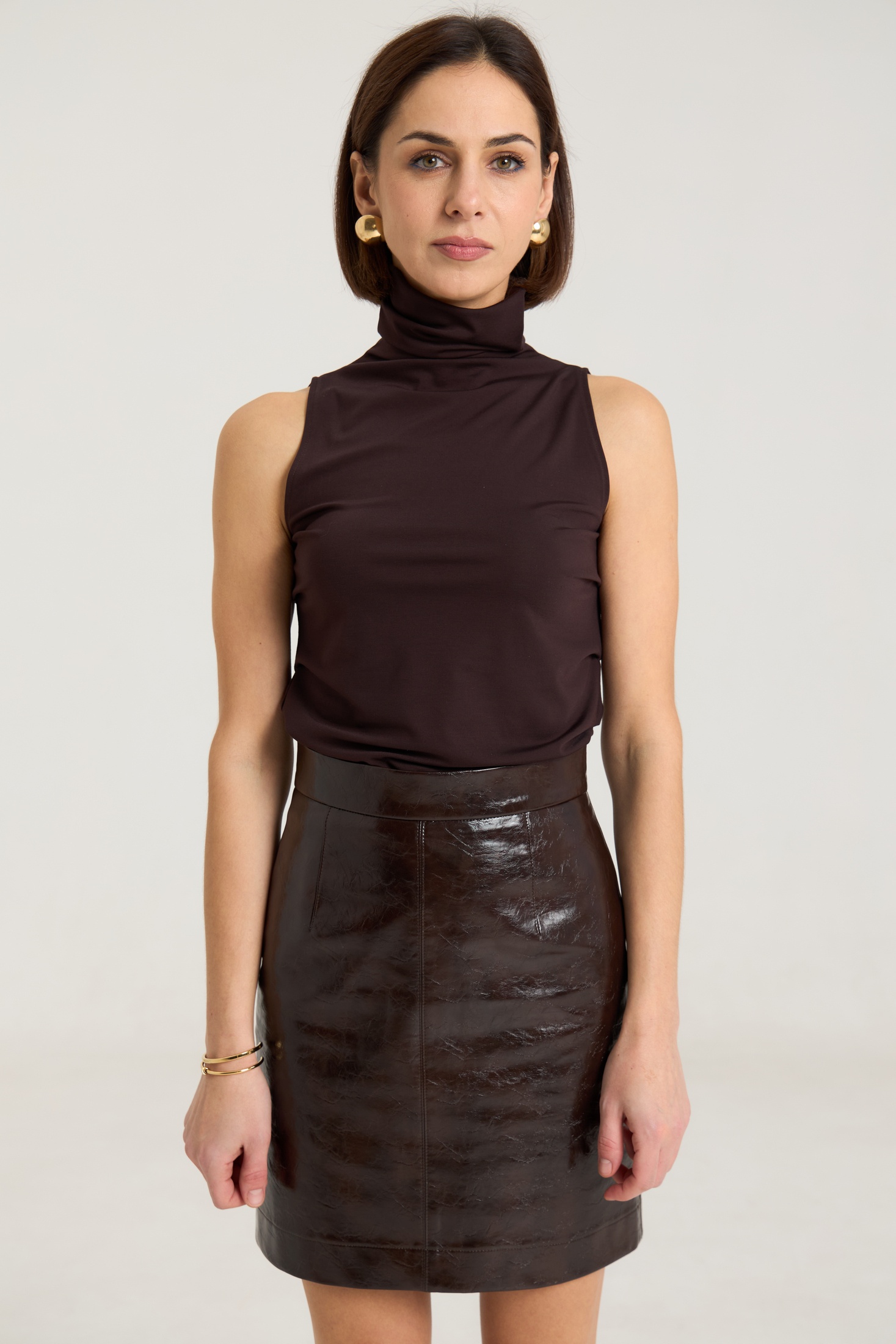 Юбка прилегающего силуэта на притачном поясе, посадка высокая , юбка на подкладке, изделие имеет центральный шов спереди и сзади. В среднем шве застежка на потайную молнию. Юбка выполнена из плотной лаковой экокожи шоколадного цвета.