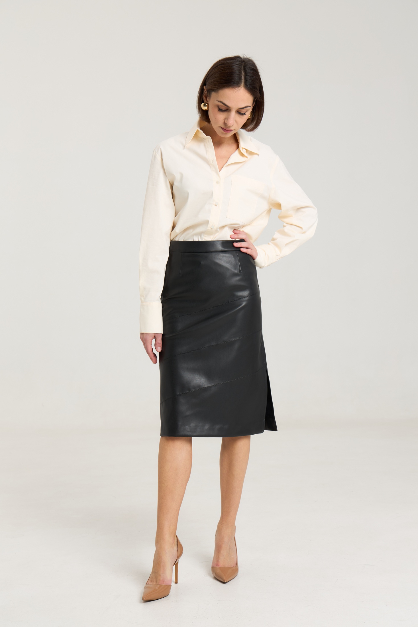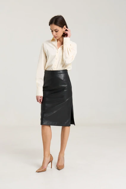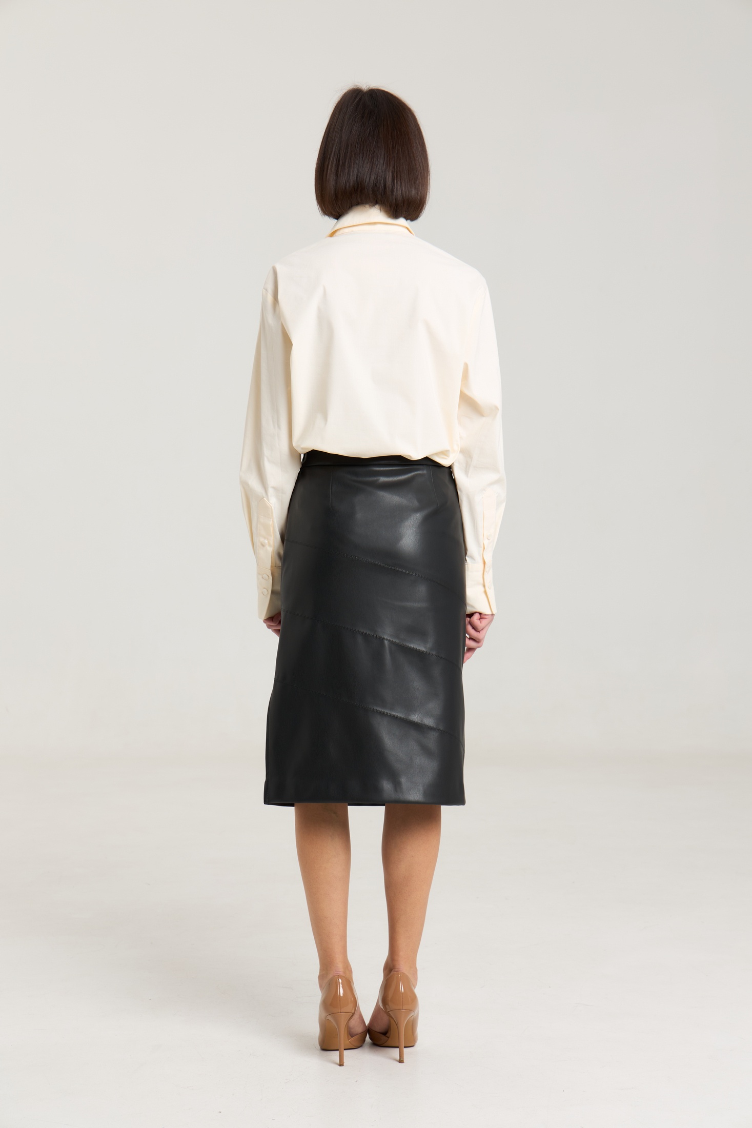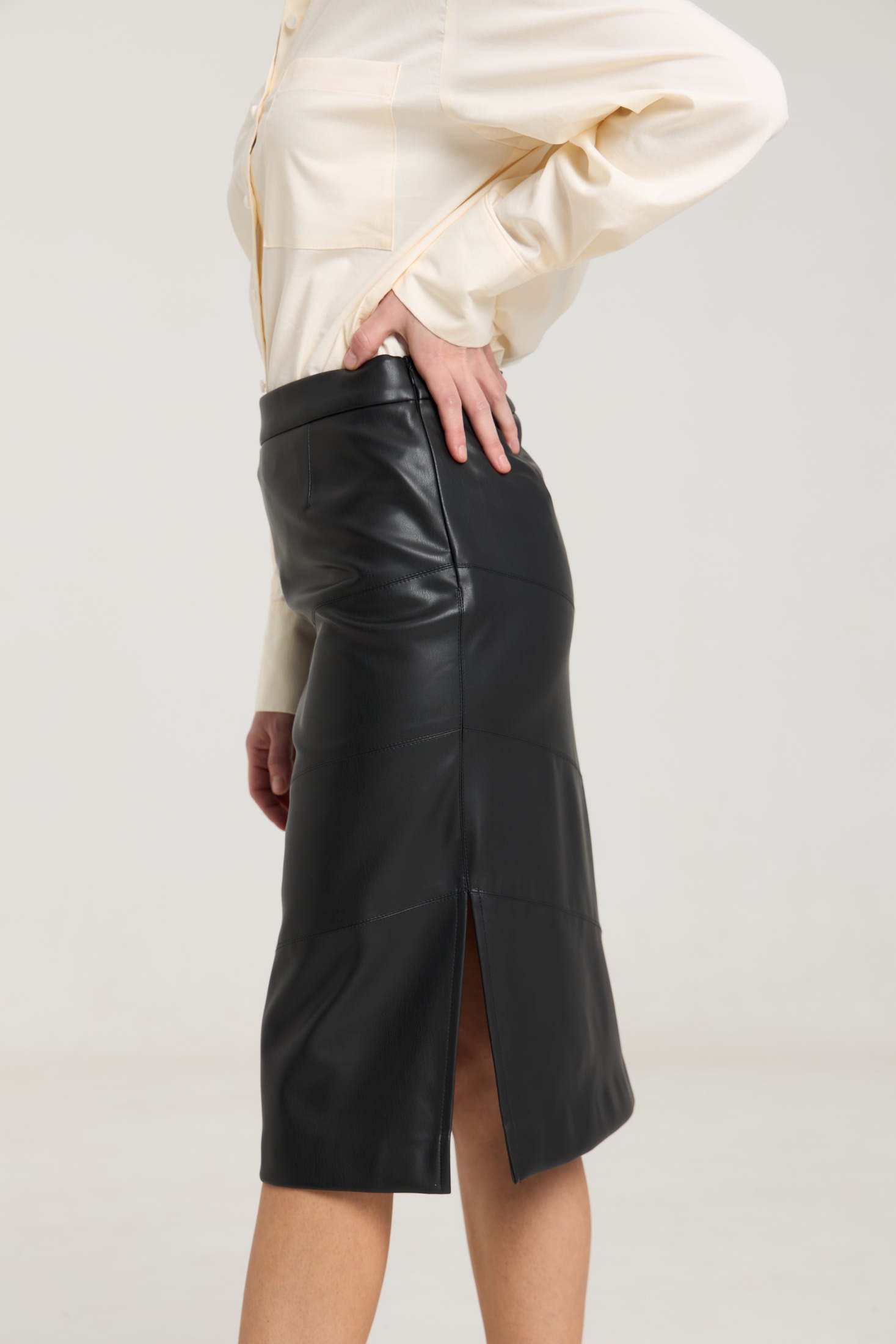 Юбка в длине миди выполнена из мягкой экокожи черного цвета, юбка на подкладке, сбоку разрез. В боковом шве застежка на потайную молнию.Юбка прилегающего силуэта на притачном поясе, резаная по косой , за счет кроя выглядит стильно и необычно. Можно снчетать с футболками, топами, свитерами, блузами.Длина 65 см с поясом,полуобхвкат талии 34 см, полуобхват бедер 45 см в 42-м размере. Рост модели на фото 168 см.