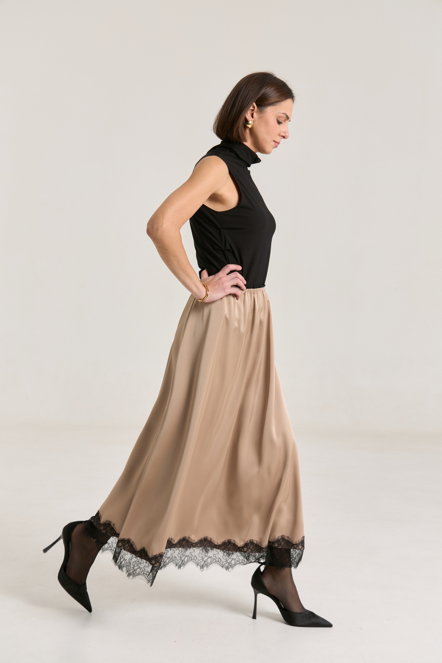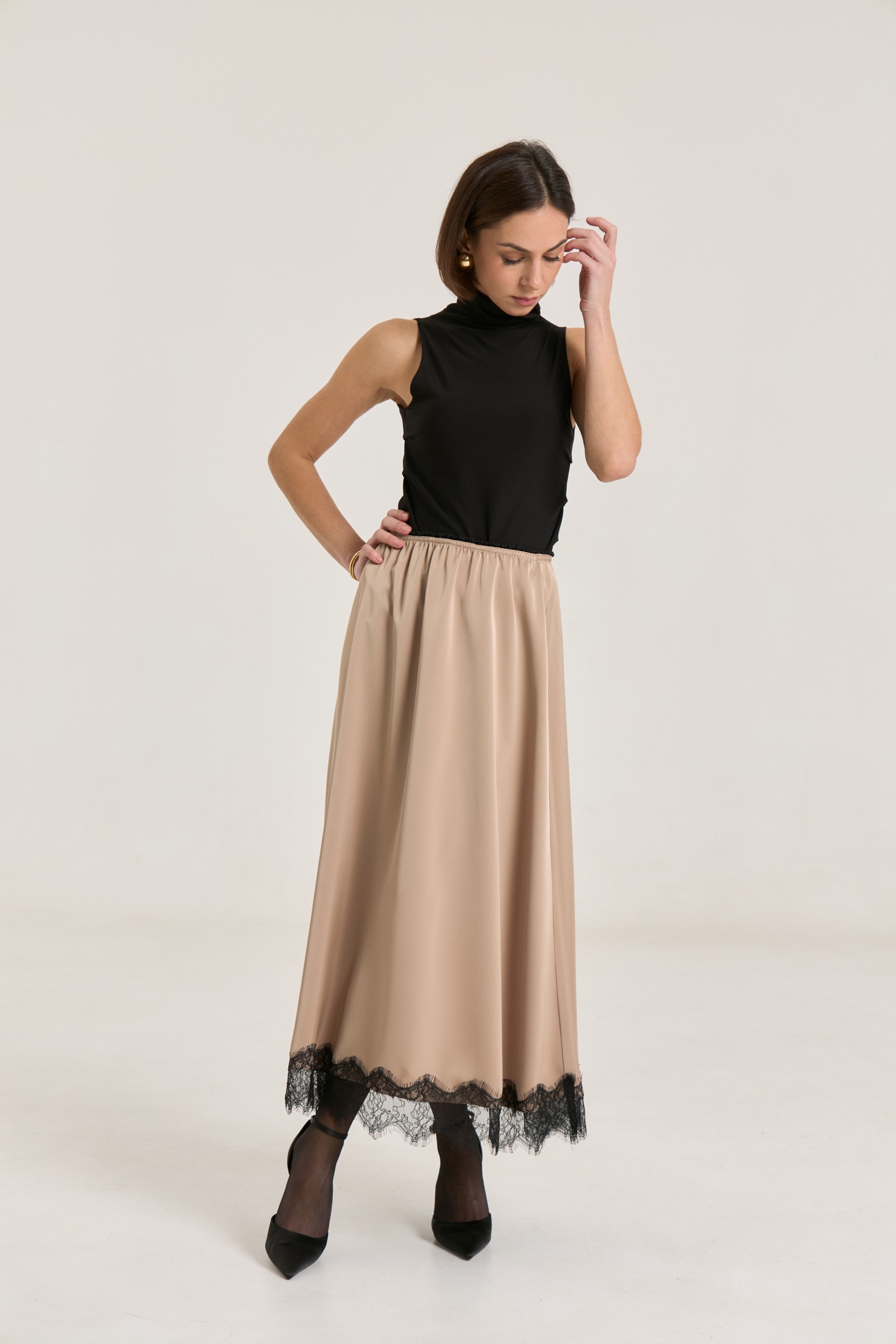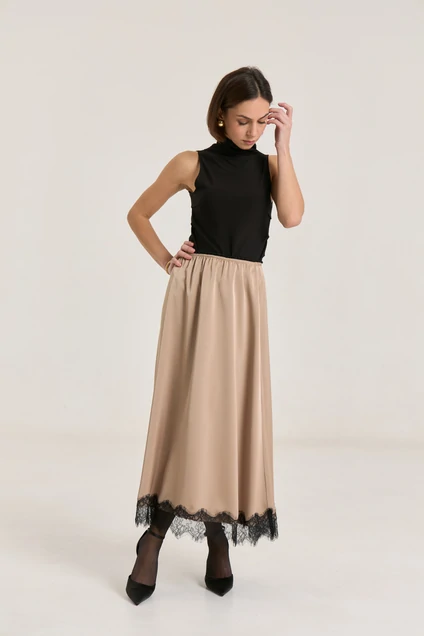 Эта элегантная юбка А-силуэта изготовлена из плотной атласной ткани песочного цвета. Модель без подкладки дополнена удобной резинкой на талии, которая отделана декоративной тесьмой, придавая изысканный акцент. Изюминкой дизайна является нижний край, украшенный изысканным французским кружевом черного цвета, что добавляет юбке особого шарма. Общая длина изделия составляет 89 см, а ширина по талии в размере 42 - 30 см. Эта юбка идеально подойдет для создания как повседневных, так и вечерних образов благодаря своей универсальности и стилю.