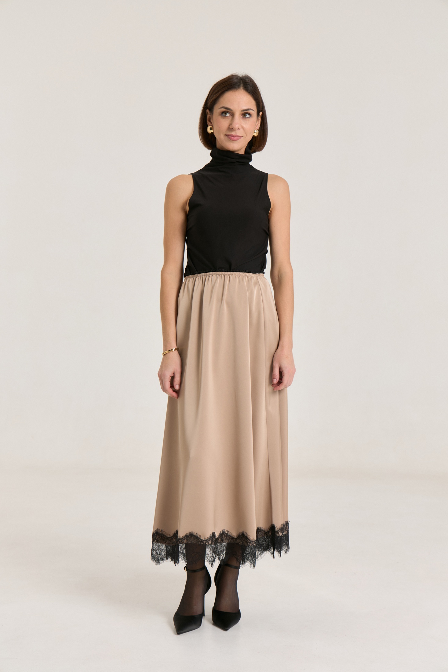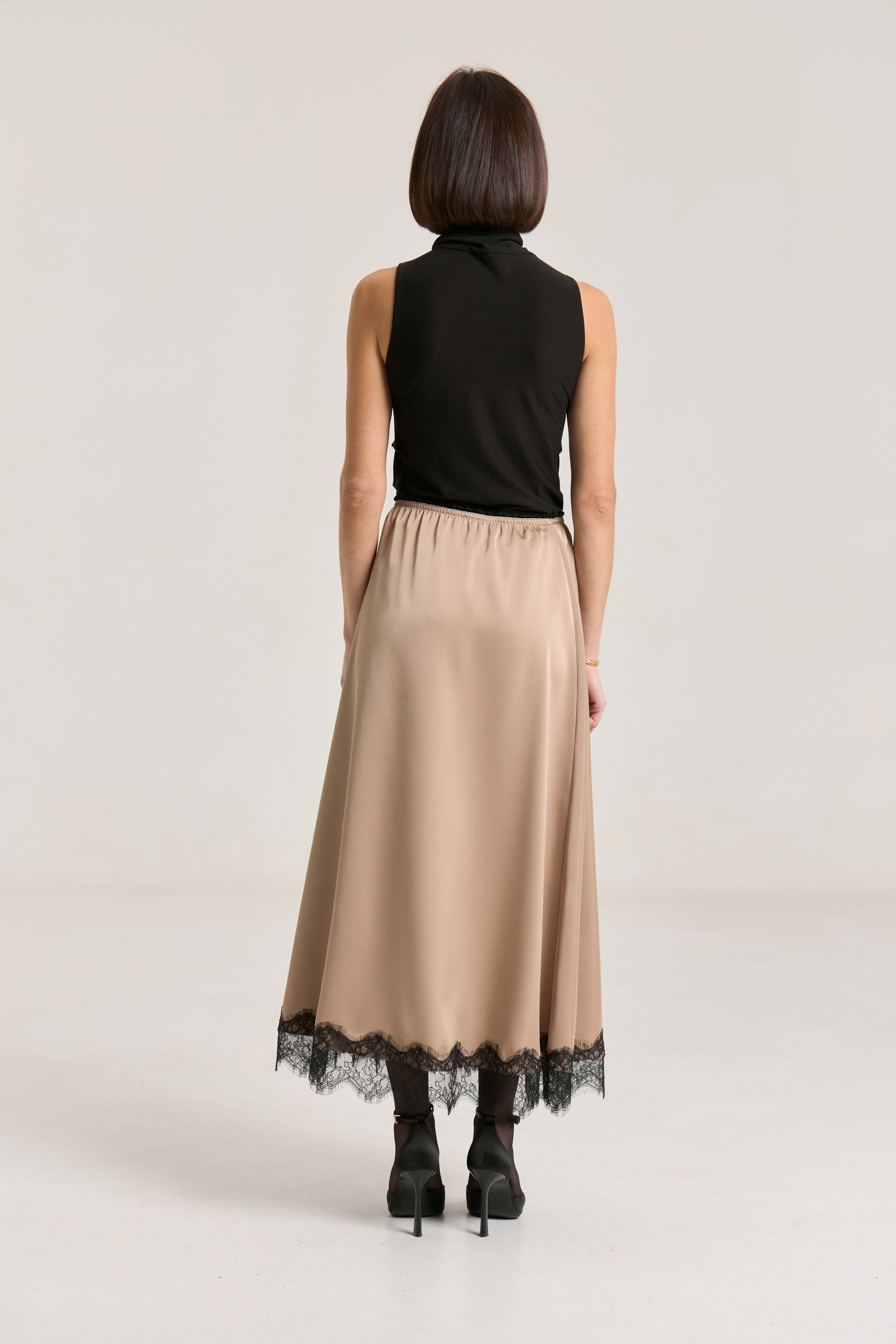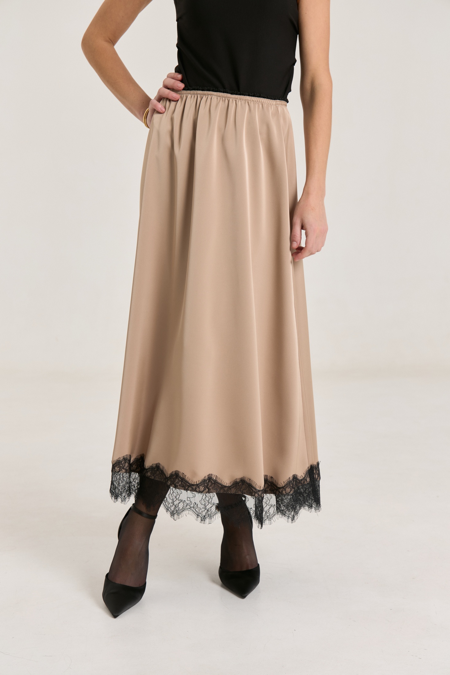 Эта элегантная юбка А-силуэта изготовлена из плотной атласной ткани песочного цвета. Модель без подкладки дополнена удобной резинкой на талии, которая отделана декоративной тесьмой, придавая изысканный акцент. Изюминкой дизайна является нижний край, украшенный изысканным французским кружевом черного цвета, что добавляет юбке особого шарма. Общая длина изделия составляет 89 см, а ширина по талии в размере 42 - 30 см. Эта юбка идеально подойдет для создания как повседневных, так и вечерних образов благодаря своей универсальности и стилю.