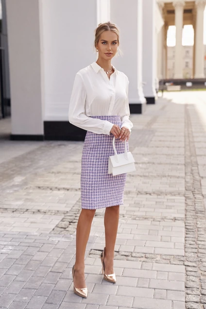 Юбка полуприлегающего силуэта. По верху юбки притачной пояс. Застежка в боковом шве на потайную молнию и пуговицу на поясе.В среднем шве заднего полотнища юбки обработана шлица.Длина юбки до линии колен.Изделие на подкладке.