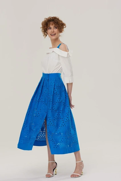 Юбка со складками из хлопковой ткани «шитье». Верх на поясе. В пояс по спинке вставлена резинка. Застежка по переду на петли и пуговицы. В боковых швах карманы. Юбка на подкладке.