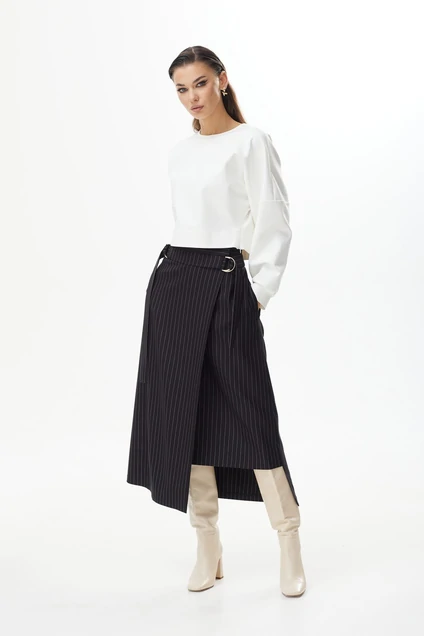 Юбка на запах с асимметричной линией низа. Длина миди. Верх на поясе. По талии юбка фиксируется дополнительным поясом и полукольцами. Юбка на подкладке.