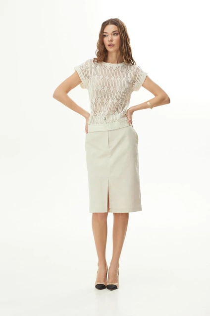 Юбка льняная прямая. Верх на поясе со шлевками.  Застежка по переду на молнию и пуговицу на поясе. По переду разрез. В боковых швах карманы. Длина за колено. Юбка на хлопковой подкладке.