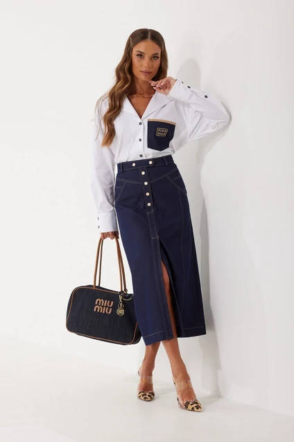 Юбка миди из джинсовой ткани. Верх на поясе со шлевками. Застежка по