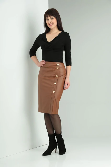 Прямая юбка прилегающего силуэта из «эко-кожи» По передней половинке юбки отделочный элемент планка с пуговицами переходящая в шлицу (планка не расстегивается). По задней половинке юбки в среднем шве застежка на потайную молнию. Верхний срез юбки обработан поясом.