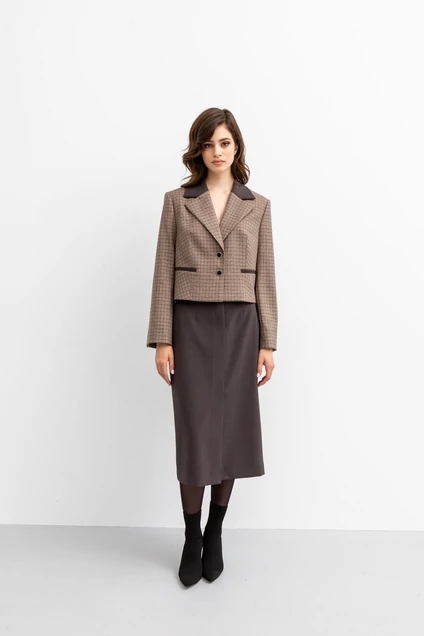 Юбка женская, полуприлегающего силуэта-«карандаш». Из высококачественной поливискозы. Изделие на притачной обтачке. Переднее полотнище с 4мя талевыми вытачками и складкой по центру, переходящей в шлицу. Заднее полотнище в талиевыми вытачками и средним швом, в который втачена потайная тесьма-молния. Изделие на подкладке. Длина миди, 74 см.