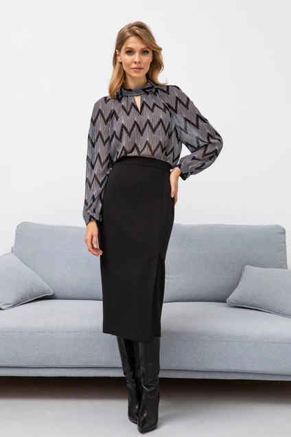 Юбка женская, полуприлегающего силуэта-«карандаш». Из высококачественного трикотажа. Изделие на притачном поясе, с застежкой на петли и пуговицы. Так же в пояс юбки вставлена эластичная тесьма. Переднее полотнище с складкой переходящей в шлицу. Заднее полотнище с средним швом, в который втачана потайная тесьма-молния. Длина по спинке-74.5