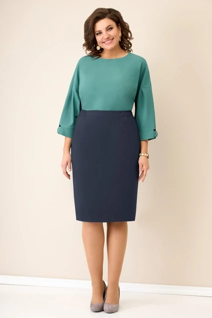 Прямая классическая юбка на полкладке из текстильной ткани. Пояс юбки втачной со вставками с резинками по бокам. По спинке юбки- застежка на пуговицу и молнию, и шлица. Длина юбки 60 см.