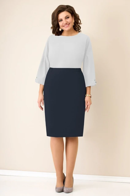 Прямая классическая юбка на полкладке из текстильной ткани. Пояс юбки втачной со вставками с резинками по бокам. По спинке юбки- застежка на пуговицу и молнию, и шлица. Длина юбки 60 см.