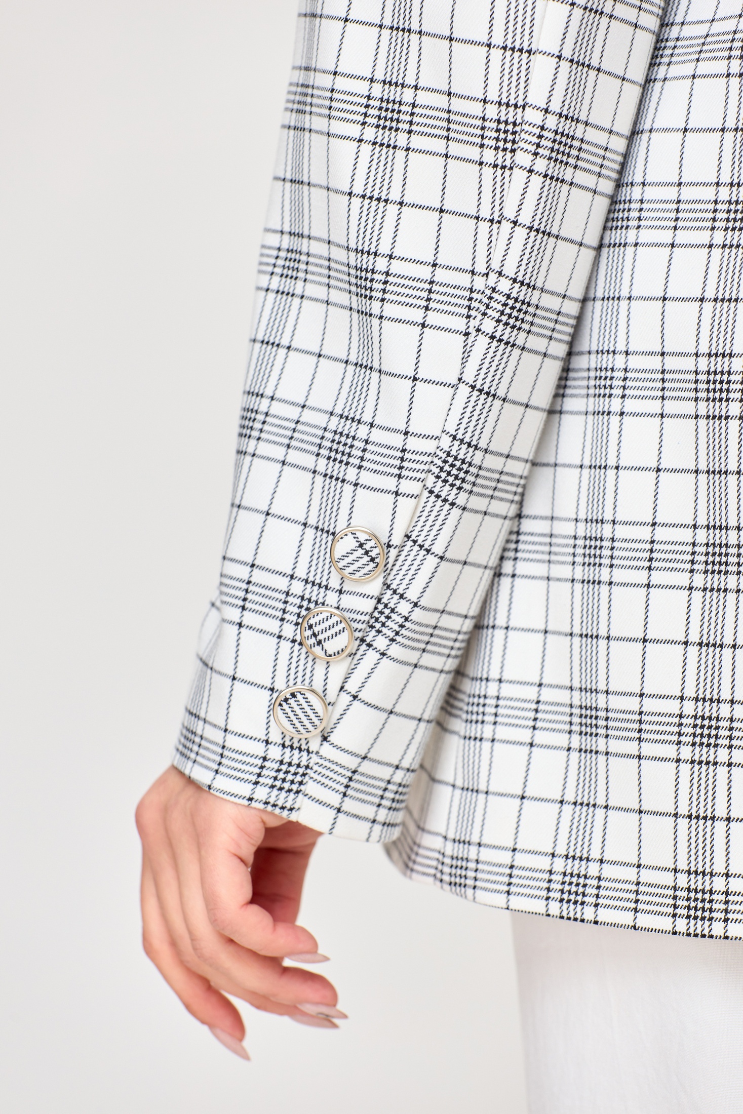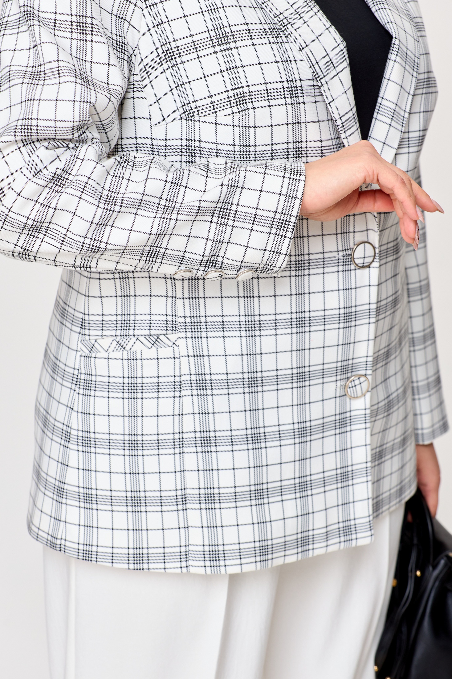 Представьте себе величественную даму, идущую с изяществом и уверенностью, восхищающую всех своим непринужденным стилем. Её образ – это искусное сплетение элегантности и современной роскоши. На ней – женский жакет, созданный для того, чтобы притягивать восхищенные взгляды! Жакет, в котором она словно воплощает элегантность и власть, олицетворяет роскошь и стиль! Он выглядит как произведение искусства: однобортный, с центральной застёжкой на две изысканные пуговицы, создающие ощущение истинного роскошного шика. Отложной воротник с лацканом придает образу особый шарм и респектабельность. Спинка и перед пиджака украшены изысканными рельефами, которые подчеркивают женственные линии фигуры. Прорезные карманы в листочку дополняют его стиль и функциональность, а подкладка добавляет ощущение роскоши и комфорта.