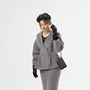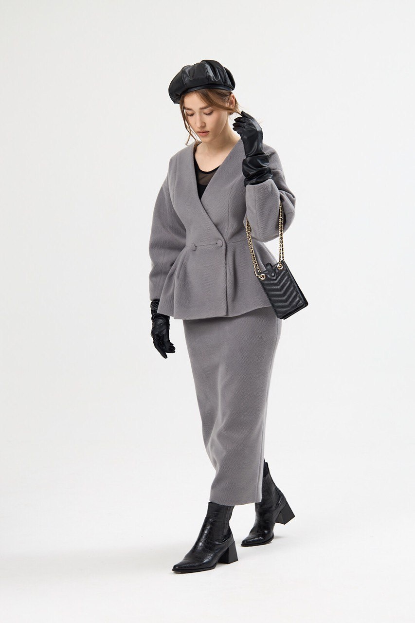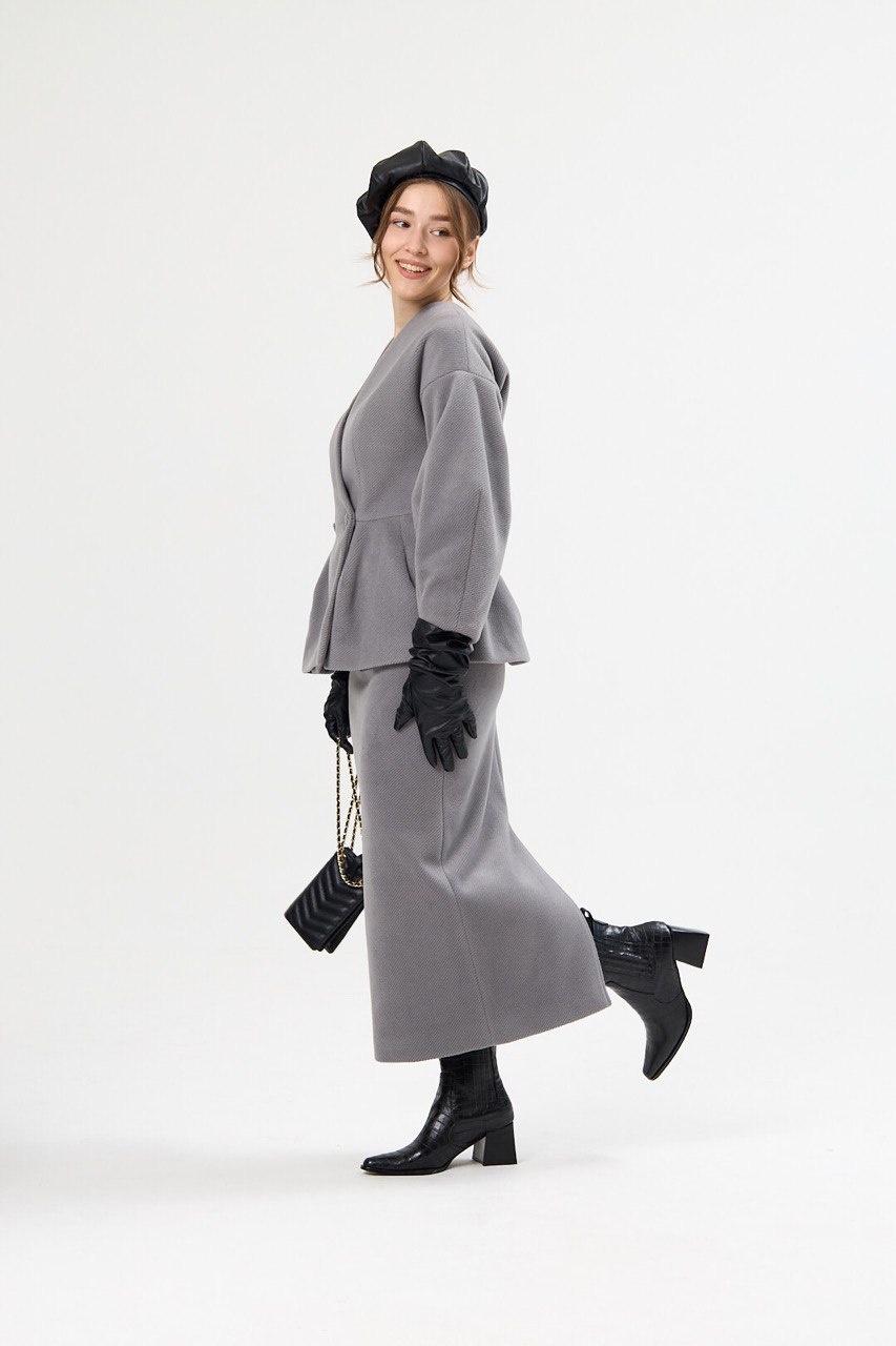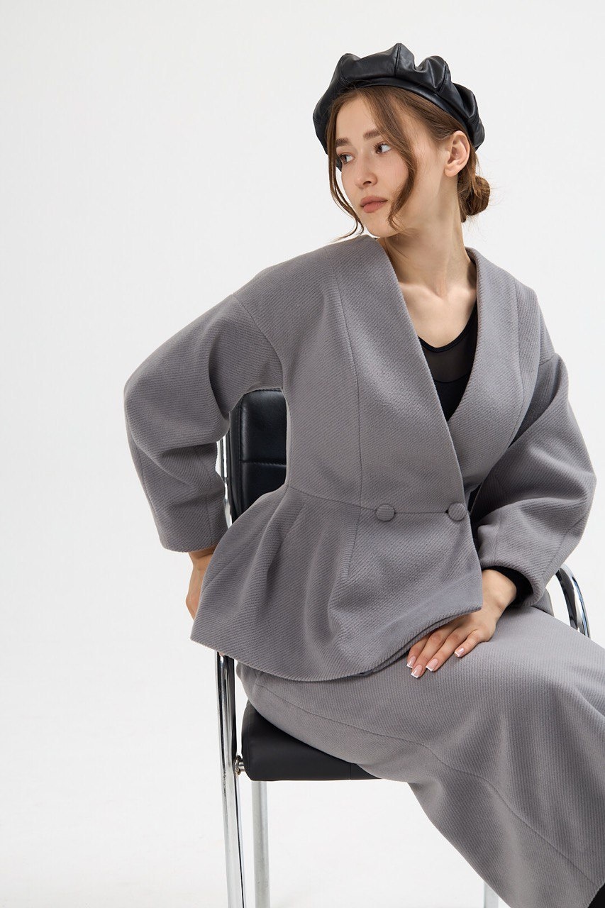 Жакет женский приталенный, двубортный, отрезной по линии талии, из костюмно-пальтовой смесовой ткани, длиной до линии бёдер. Верхняя часть переда с рельефами, верхняя часть спинки с рельефами и средним швом. Нижняя часть переда и спинки-баска с вытачками. Рукав спущенный укороченный, с вытачками снизу, создающими объёмность. Вырез горловины V-образный. В шве талии обработаны потайные обтачные петли. Жакет на поливискозной подкладке.