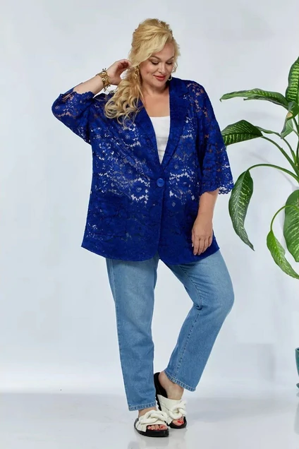 Бренд белорусской женской одежды больших размеров Anastasia представляет элегантный кружевной жакет женский больших размеров. Жакет прямого силуэта со спущенным плечом. Рукав 3/4 длины. Застежка на пели и пуговицы, воротник пиждачного типа. По полочке идут накладные карманы, низ фигурный. Стильный жакет оверсайз невероятно удобный и практичный. Он идеально дополнит образ в офис с юбкой или брюками. Отличный вариант в офис, в школу, на работу, на каждый день.Наряд подойдет как пиджак праздничный, вечерний, нарядный на вечеринку, на прогулку, на корпоратив, на свадьбу для подружек невесты. Жакет выгодно подчеркнет достоинства фигуры и скроет недостатки, подходит для девушек любых размеров одежды. Комфортный удобный, хорошая посадка и современный дизайн. Жакет летний будет стильным решением для беременных, для будущих мам, для полных женщин. Жакет позволяет с легкостью переделать повседневный наряд в праздничный. Длина по спинке: (58-60)- 77см, (62-64)-79 см Длина рукава: (58-64)- 30см.