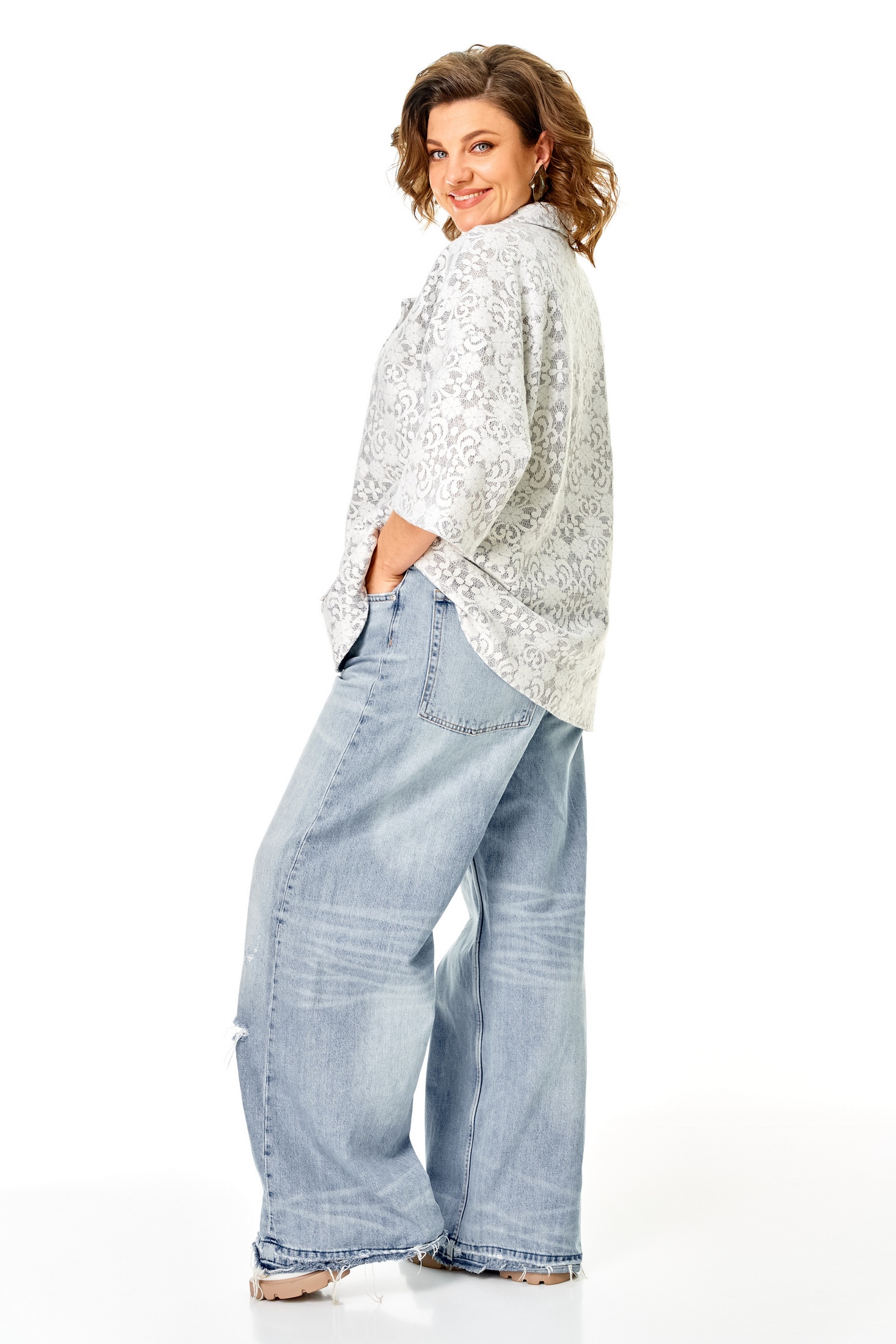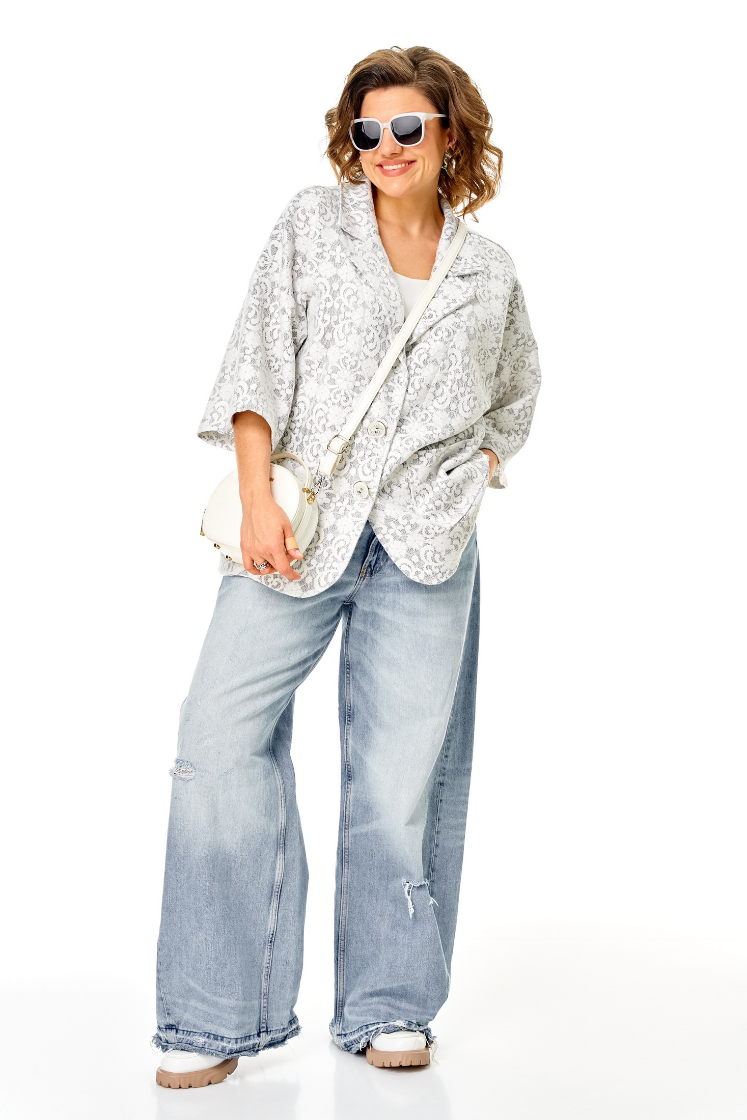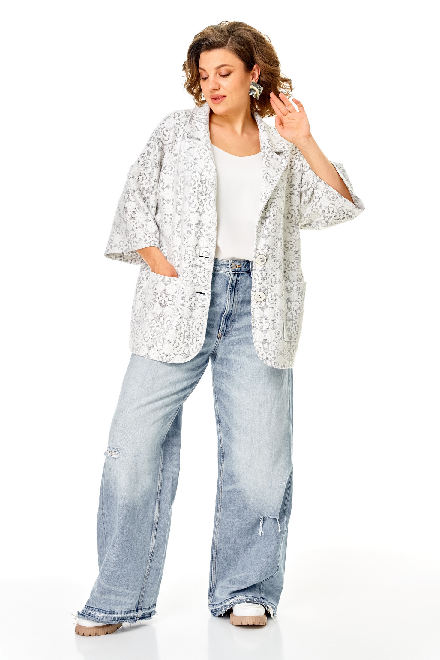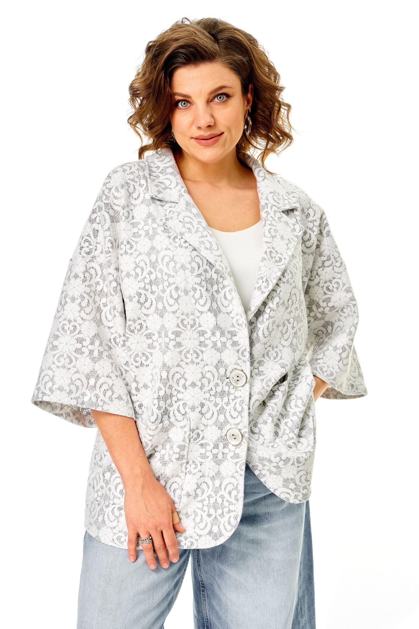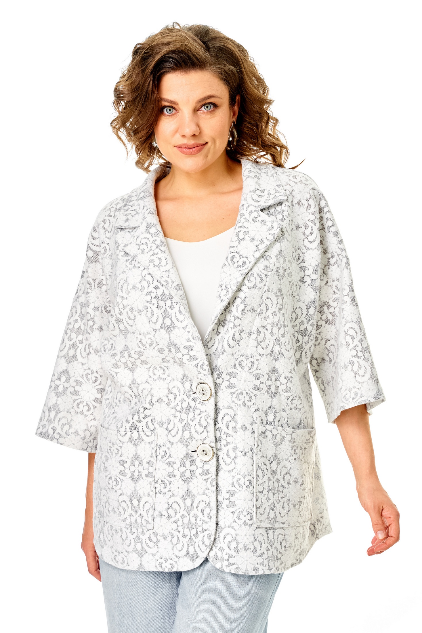 Жакет 1355 серо-белый Anastasia — из коллекции бренда Anastasia, выполнен из оригинального трикотажного полотна, напоминающего легкое кружево. Эта модель прямая с рукавом 3/4, имеет спущенное плечо и удобную застежку на пуговицу, что придает ей классический стиль. Отличительной чертой жакета являются накладные карманы и фигурный низ. С длиной по спинке 76-78 см и длиной рукава 28 см, он станет идеальным выбором для весеннего и летнего сезона. Светлые, серо-белые цвета изделия подойдут для повседневного или офисного гардероба, придавая вашему образу легкость и женственность.