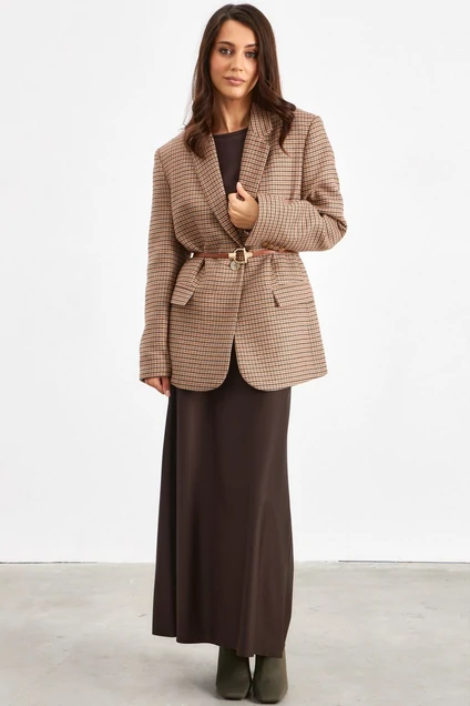 Жакет однобортный, в коричневую клетку, прямого кроя. Жакет на подкладке, по бокам функциональные карманы. В комплекте пояс для создания разных образов.