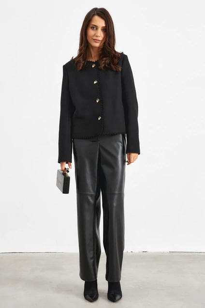 Жакет прямого кроя, выполнен из фактурной ткани в черном цвете. По переду застежка на стильные дизайнерские пуговицы. Рукав втачной, по краю всего изделия кант.