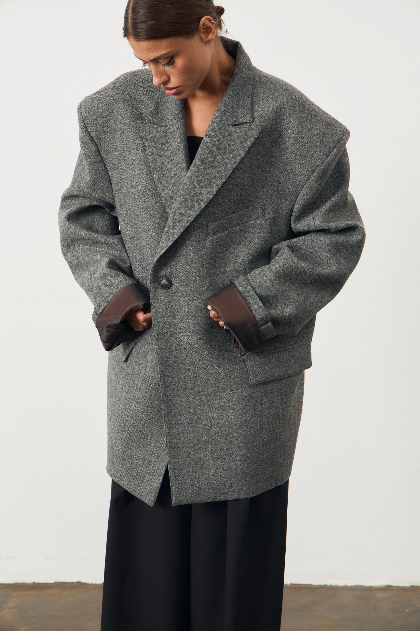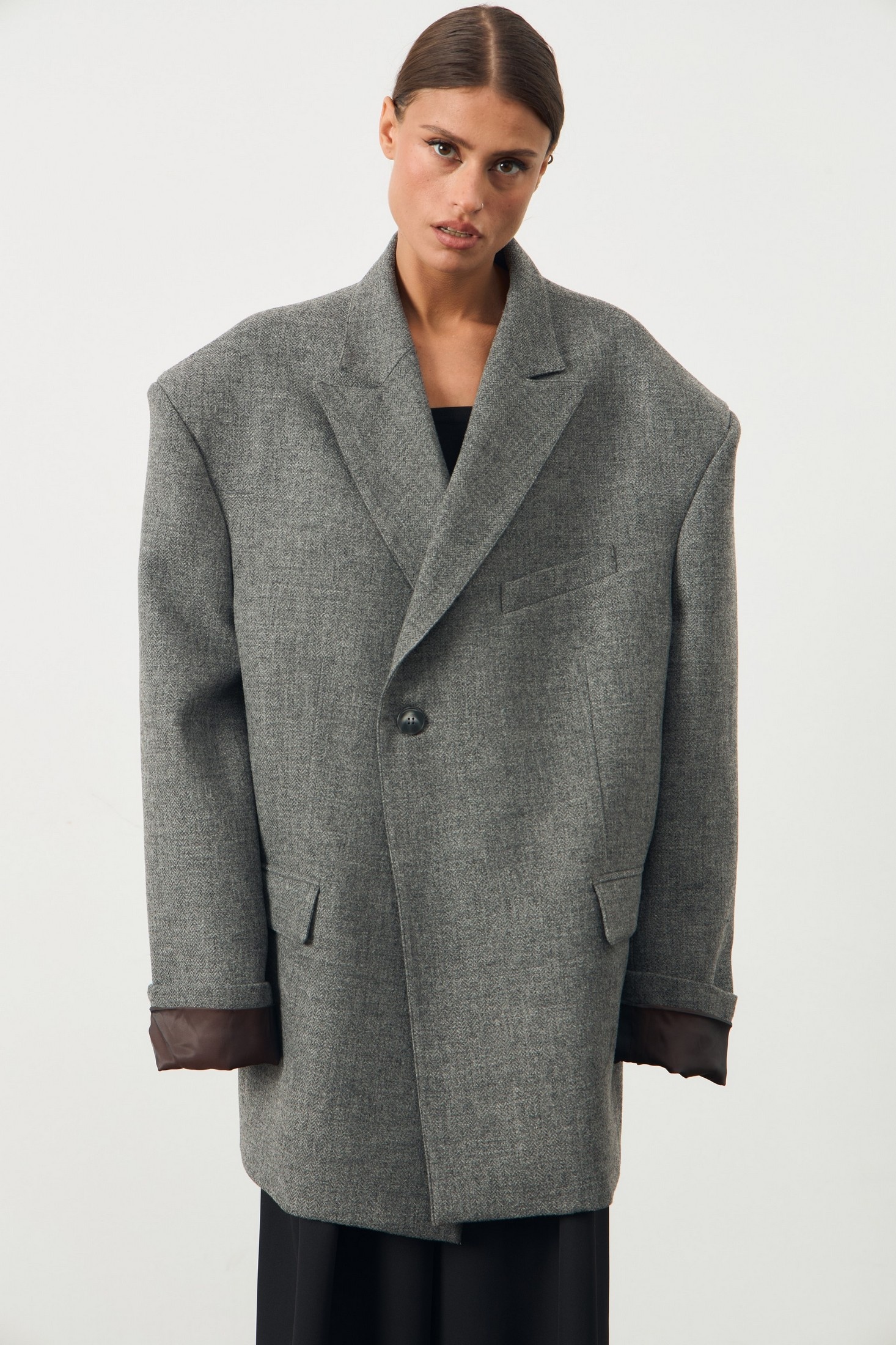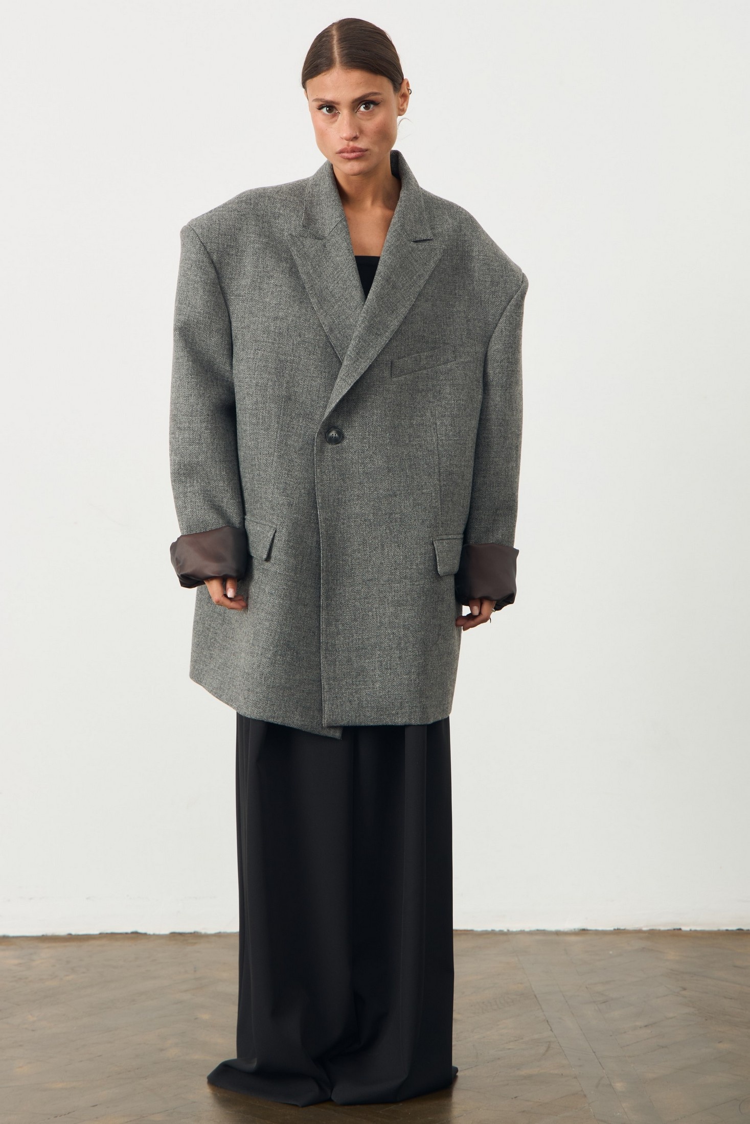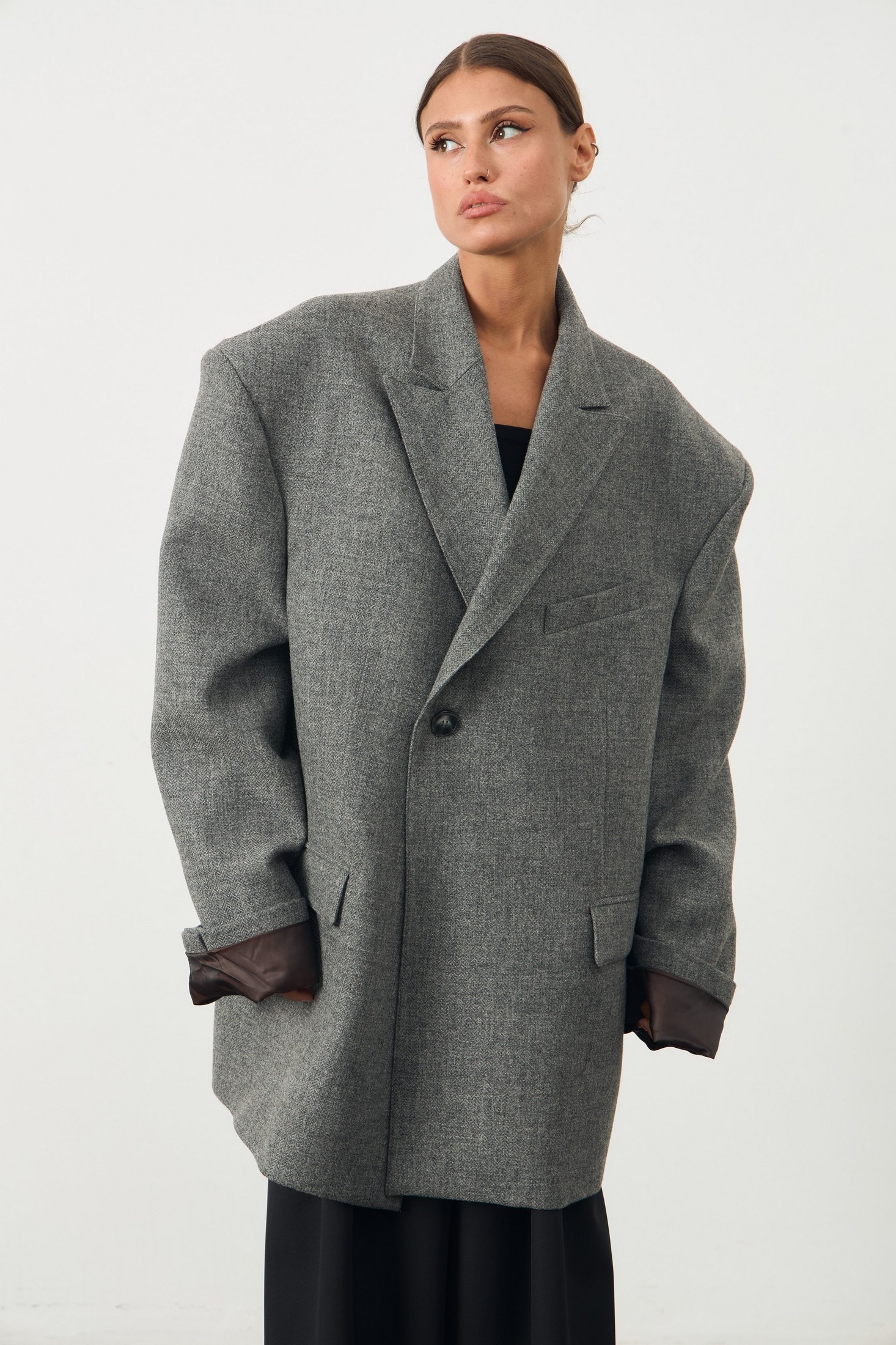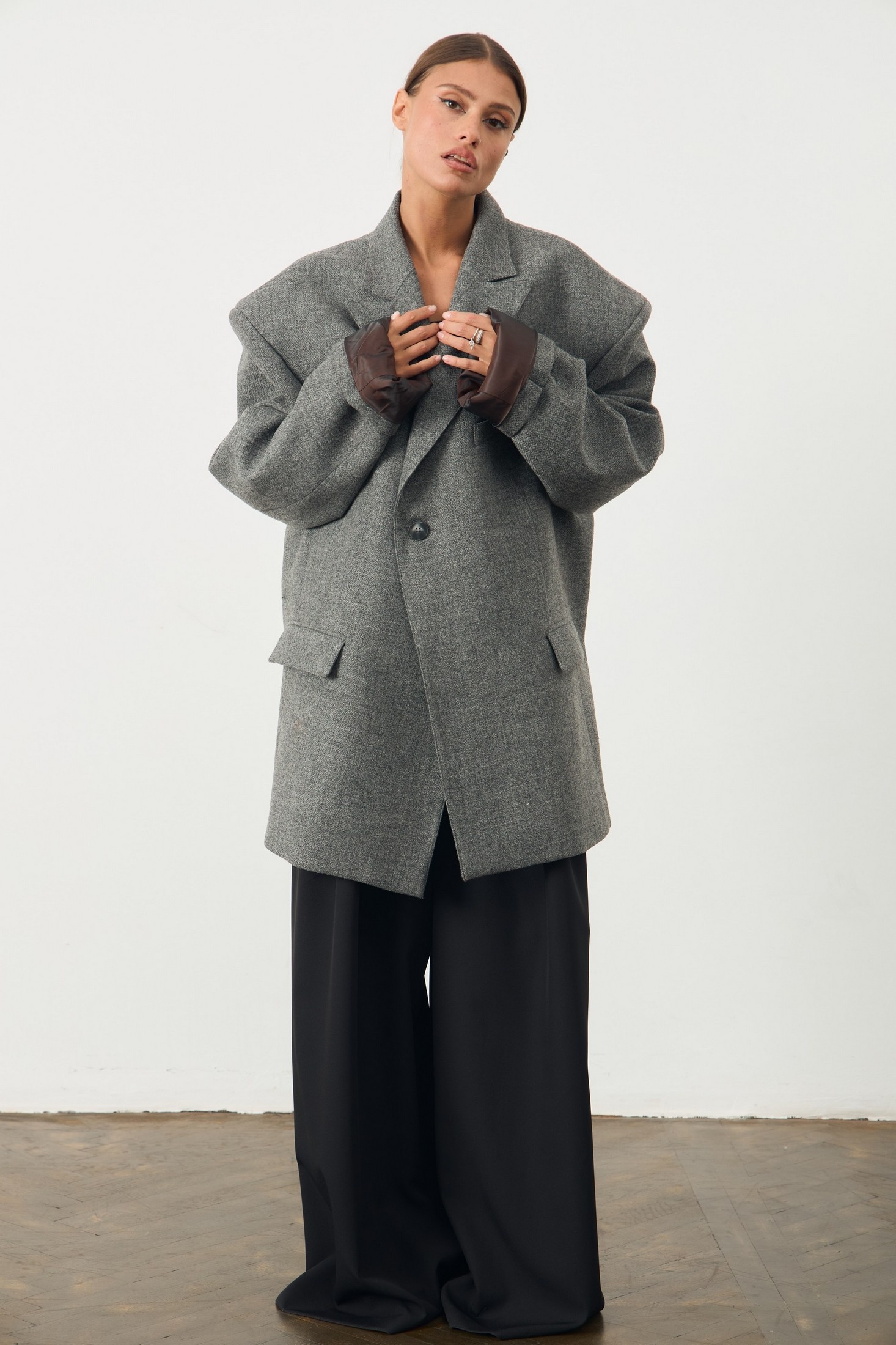 Оверсайз жакет серого цвета выполнен в стильном и практичном дизайне. Модель обладает удлиненной линией плеч, что придает образу особый акцент. Жакет на одну пуговицу, что добавляет элегантности и удобства в использовании. На передней части изделия расположены карманы с листочкой, удобные для хранения мелких предметов. Модель оснащена подкладкой, что делает ее идеальным выбором для прохладной погоды. Эта модель onesize подходит для создания разнообразных образов благодаря своему универсальному дизайну и цвету.