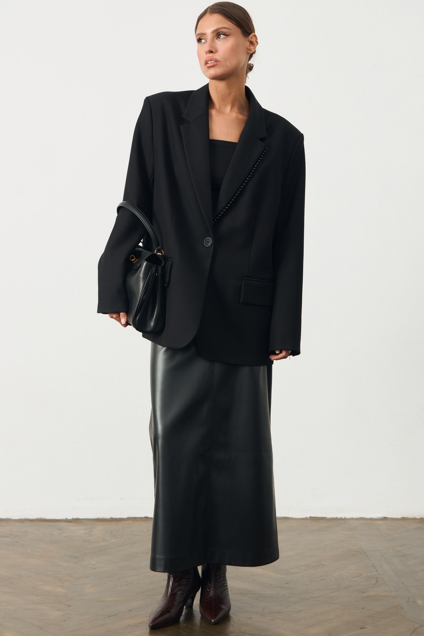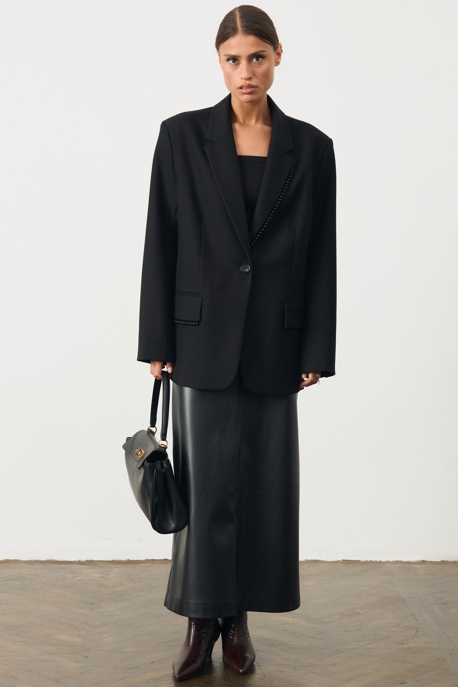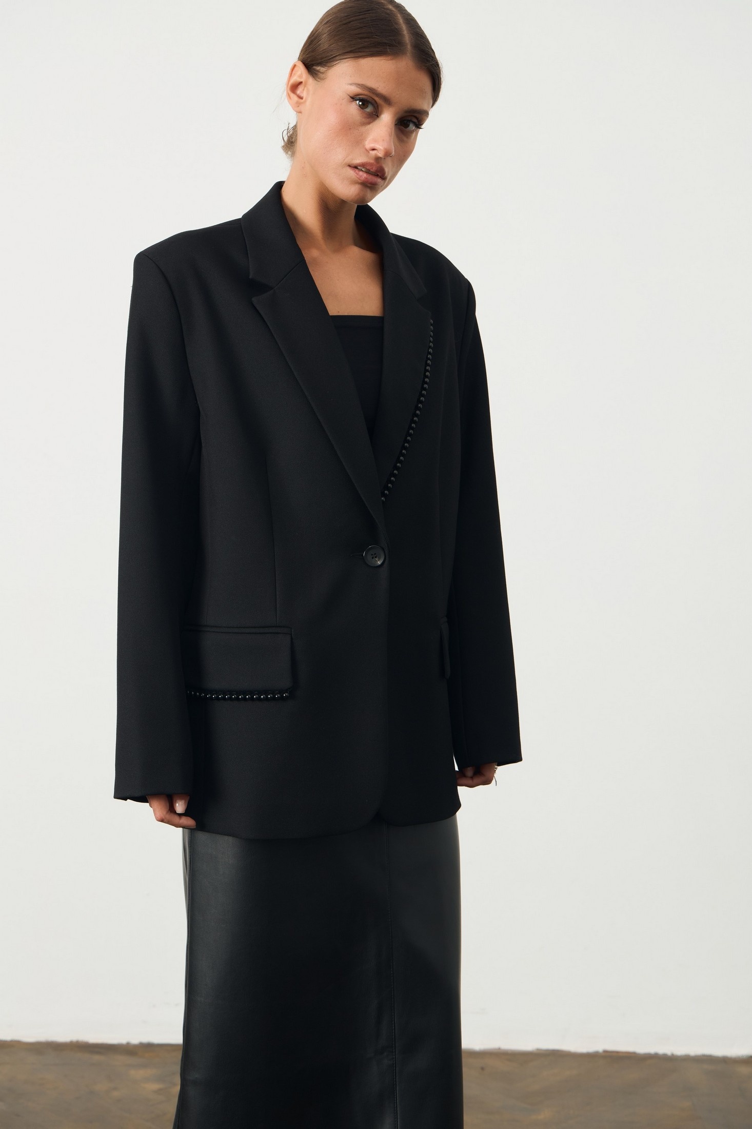 Жакет прямого кроя, однобортный, полностью на подкладке, выполнен из костюмной ткани. По переду изделия функциональные карманы с декорированным клапаном. По спинке разрезы в боковых швах. Застежка на пуговицы.
