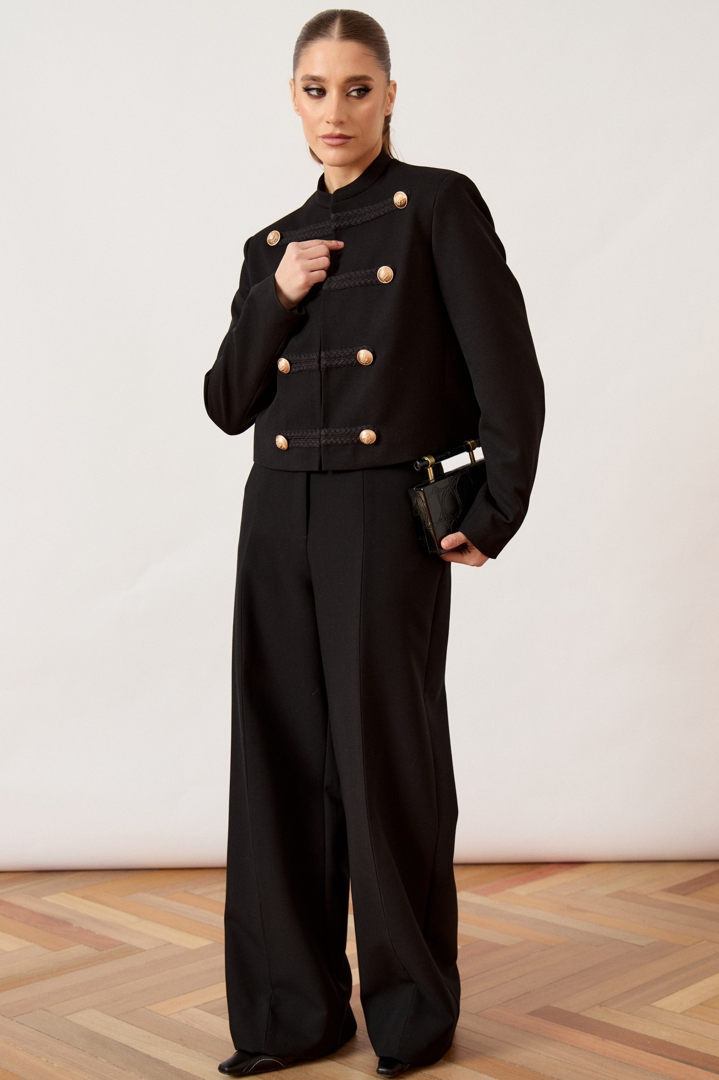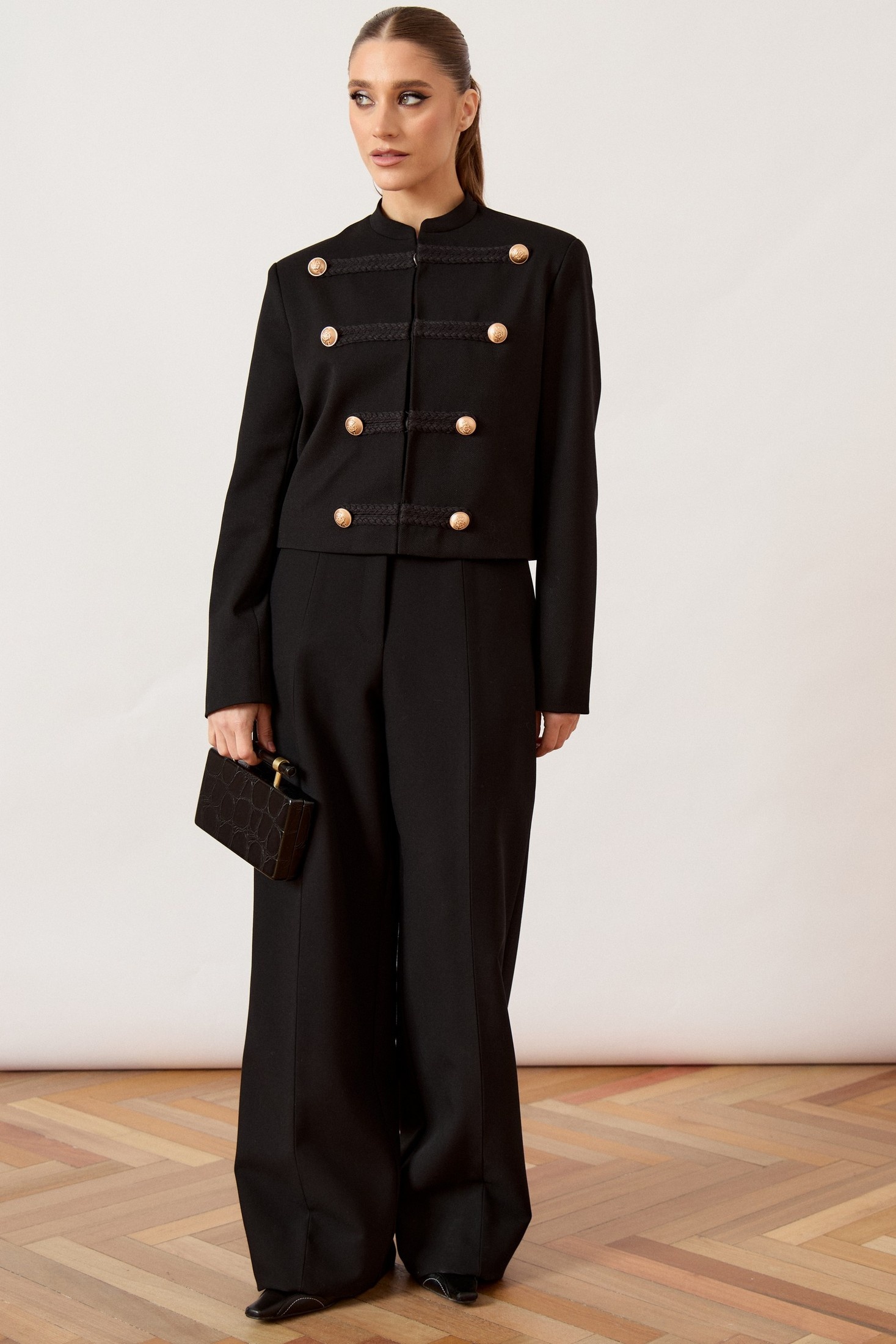 Жилет женский, прямого силуэта, выполнен из плотной костюмной ткани. Модель с воротником-стойкой и глубоким асимметричным запахом на правую сторону. Главной декоративной особенностью изделия являются две пары функциональных завязок из основной ткани, расположенных по правому борту, которые фиксируются на мягкие банты. Перед и спинка с талиевыми вытачками для обеспечения легкого прилегания. Линия плеча укорочена, пройма обработана обтачкой вчистую. Спинка со средним швом. Изделие на подкладке.