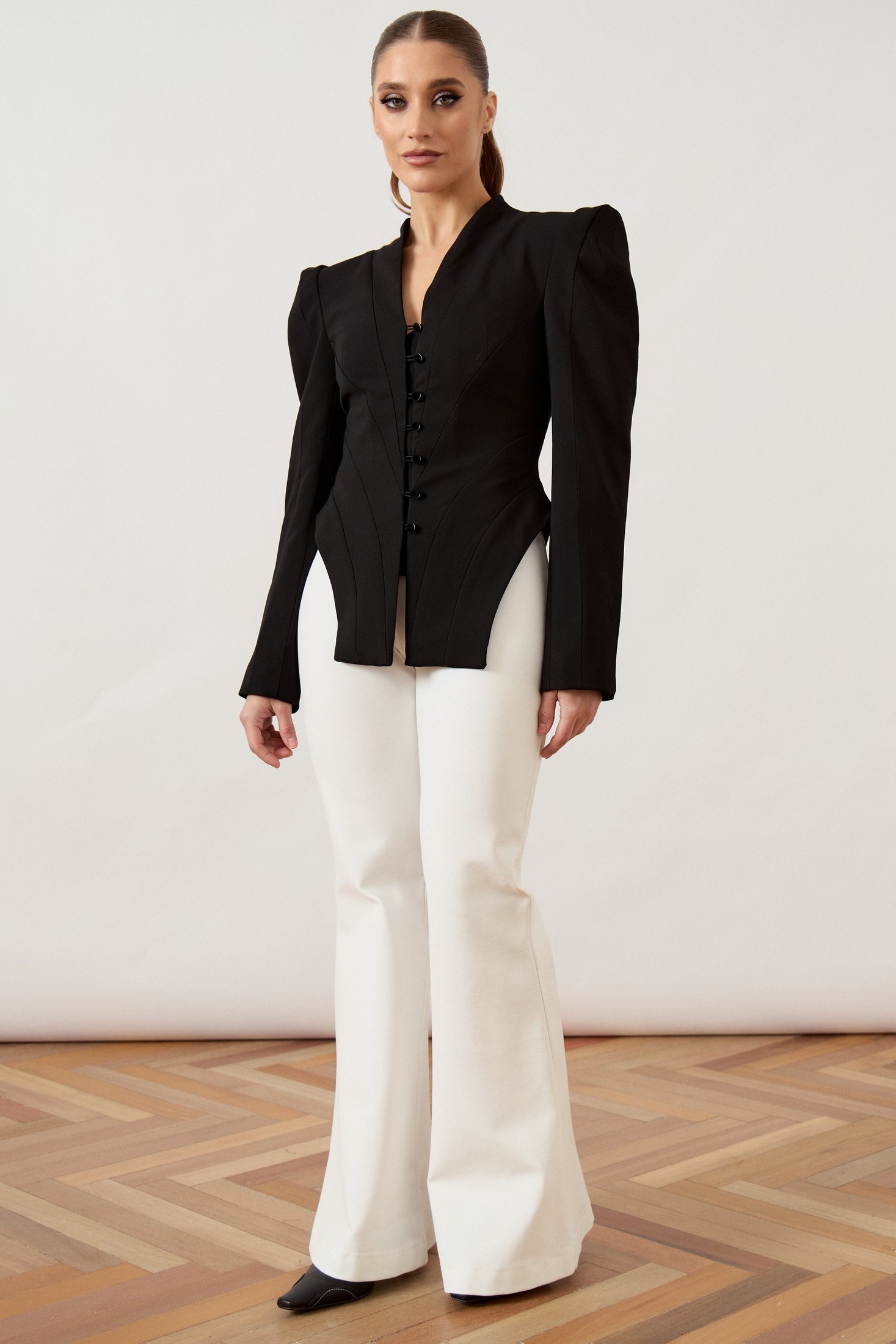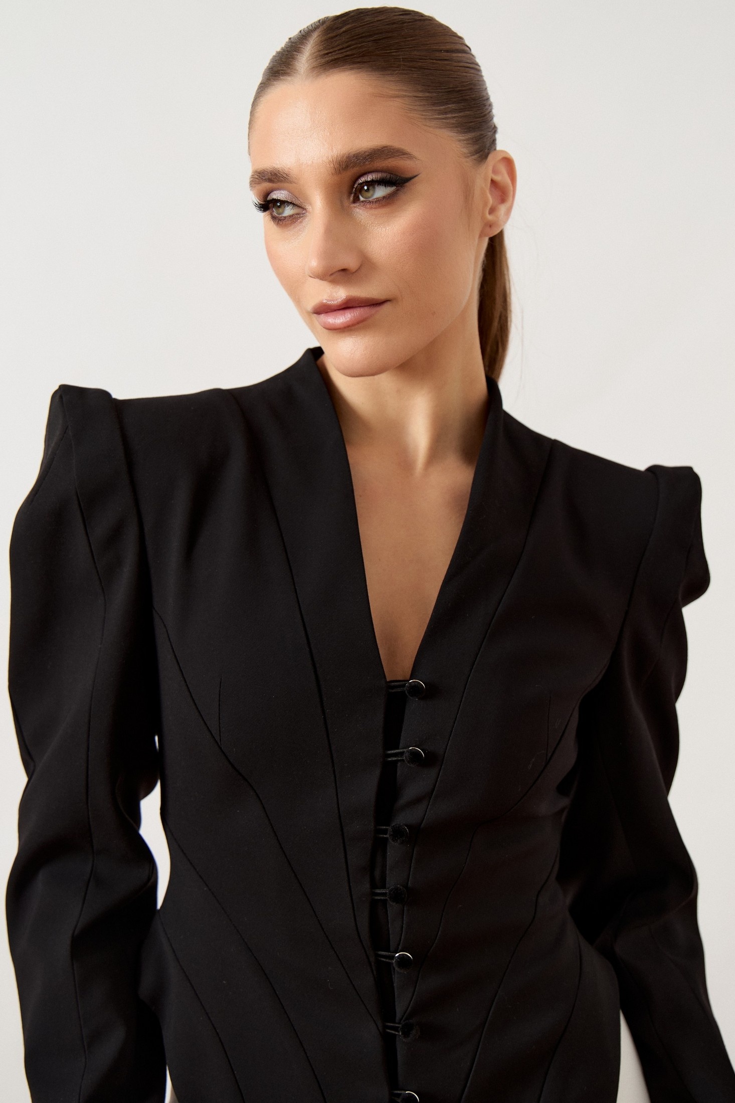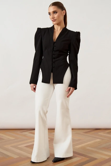 Жакет приталенного силуэта из плотной костюмной ткани черного цвета, на притачной подкладке. Модель с глубоким V-образным вырезом горловины и небольшим воротником-стойкой по спинке. Центральная застежка на пять навесных петель и декоративные пуговицы. Полочка сложного кроя с веерными рельефами, формирующими акцент на талии, и высокими разрезами по боковым швам. Плечевой пояс подчеркнут втачными длинными рукавами с объемной сборкой и высокой головкой.