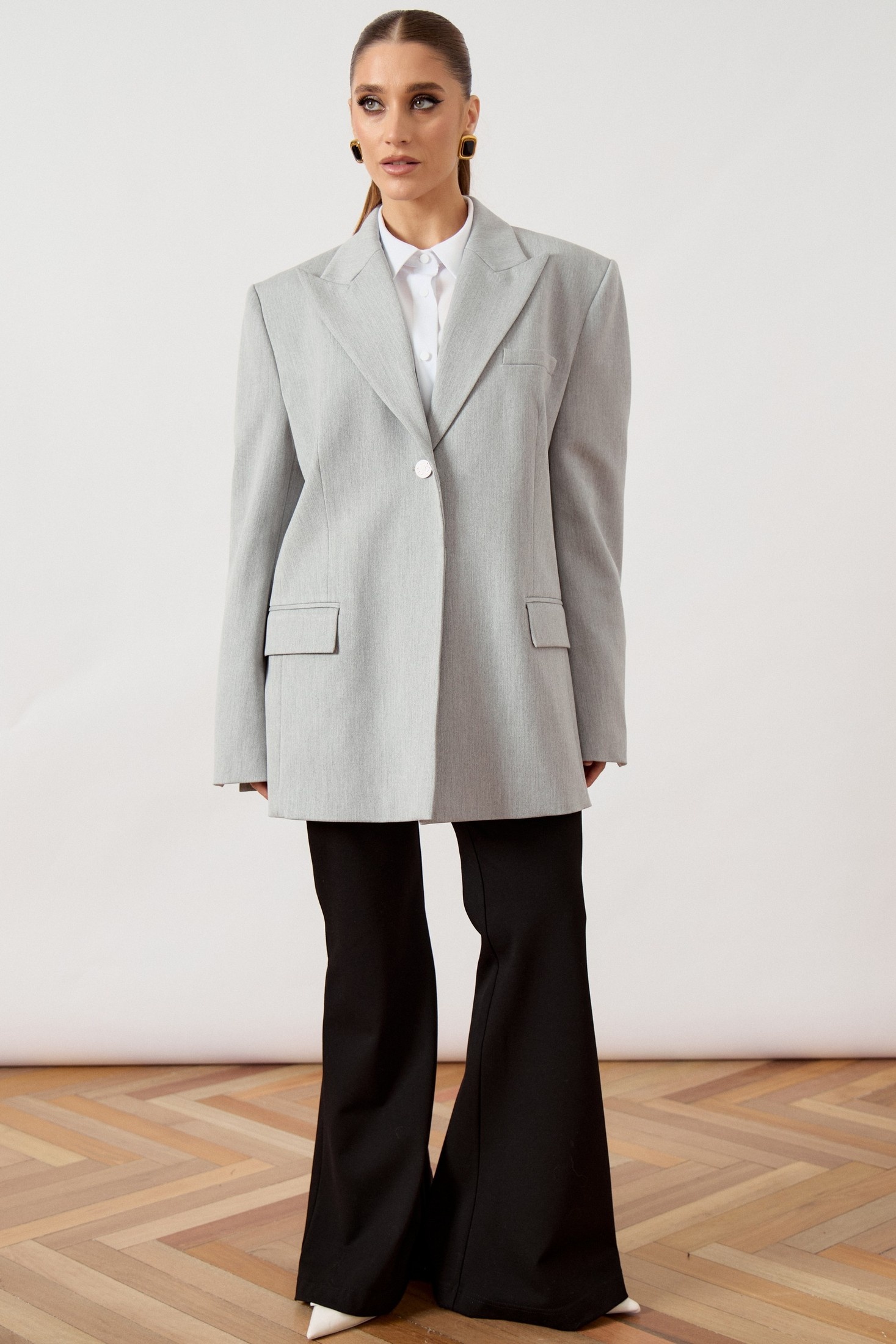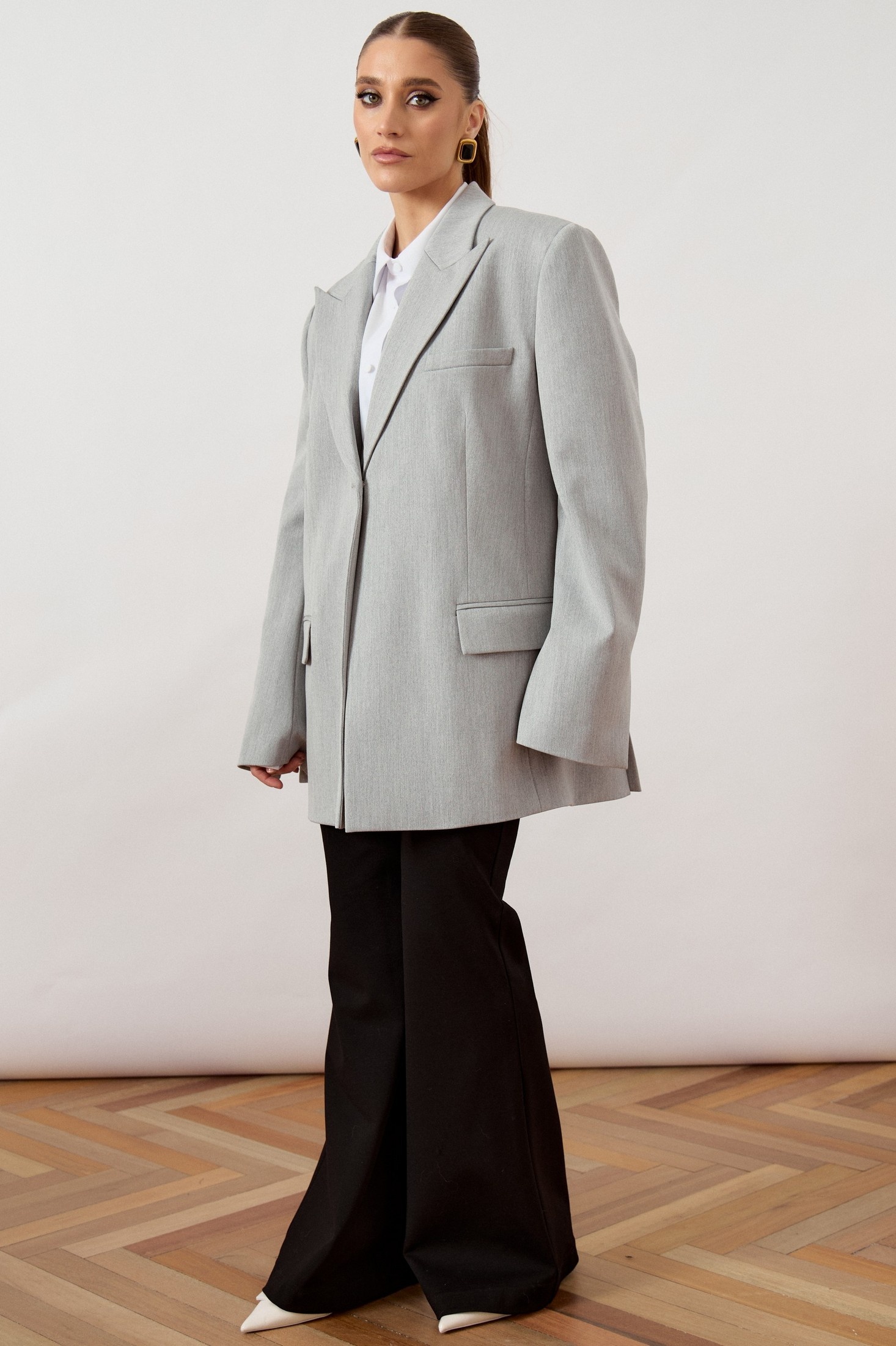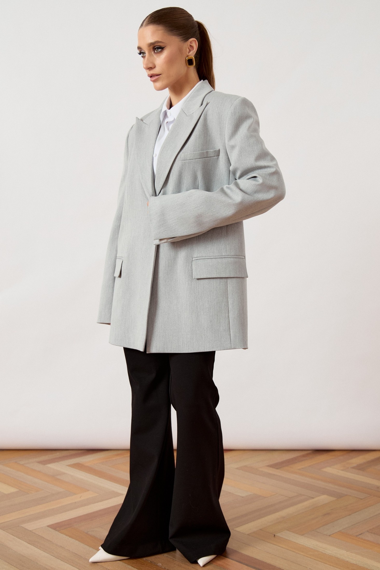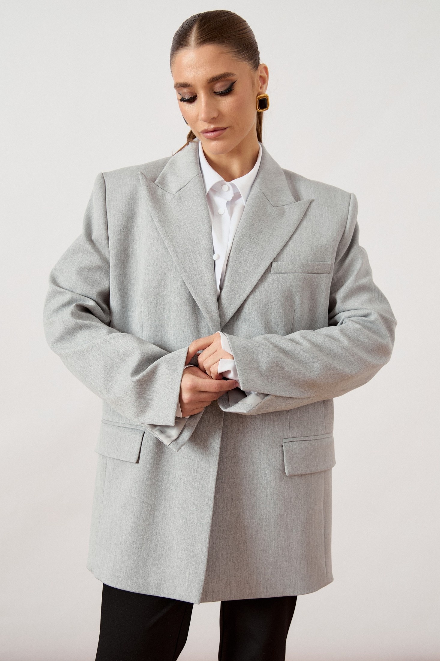 Жакет мужского кроя (оверсайз) выполнен из костюмной ткани светло-серого цвета, на притачной подкладке. Модель прямого свободного силуэта с акцентной расширенной линией плеча. Воротник классический пиджачного типа с острыми лацканами. Центральная застежка на одну декоративную пуговицу контрастного светлого оттенка. Полочка с нагрудным прорезным карманом с листочкой слева и двумя функциональными горизонтальными прорезными карманами с клапанами в нижней части изделия. Рукав втачной, длинный, двухшовный, свободного прилегания. Спинка со средним швом и шлицей для свободы движения. Нижний край жакета обработан классическим швом вподгиб