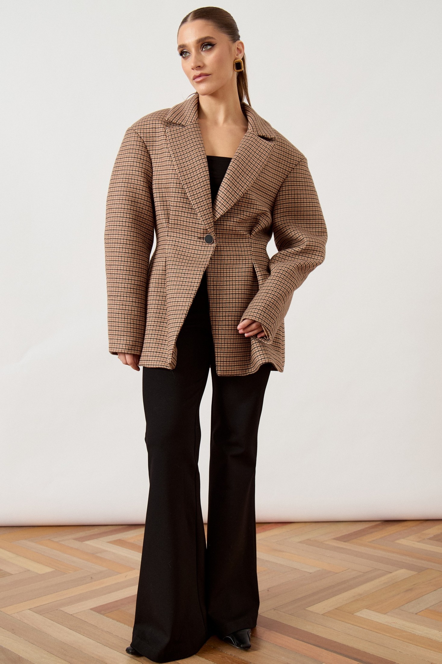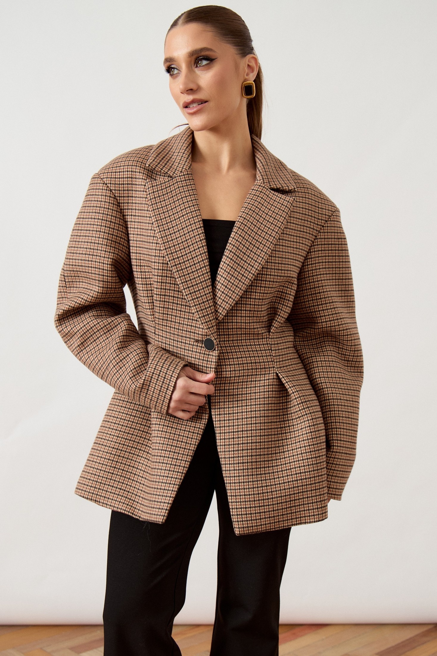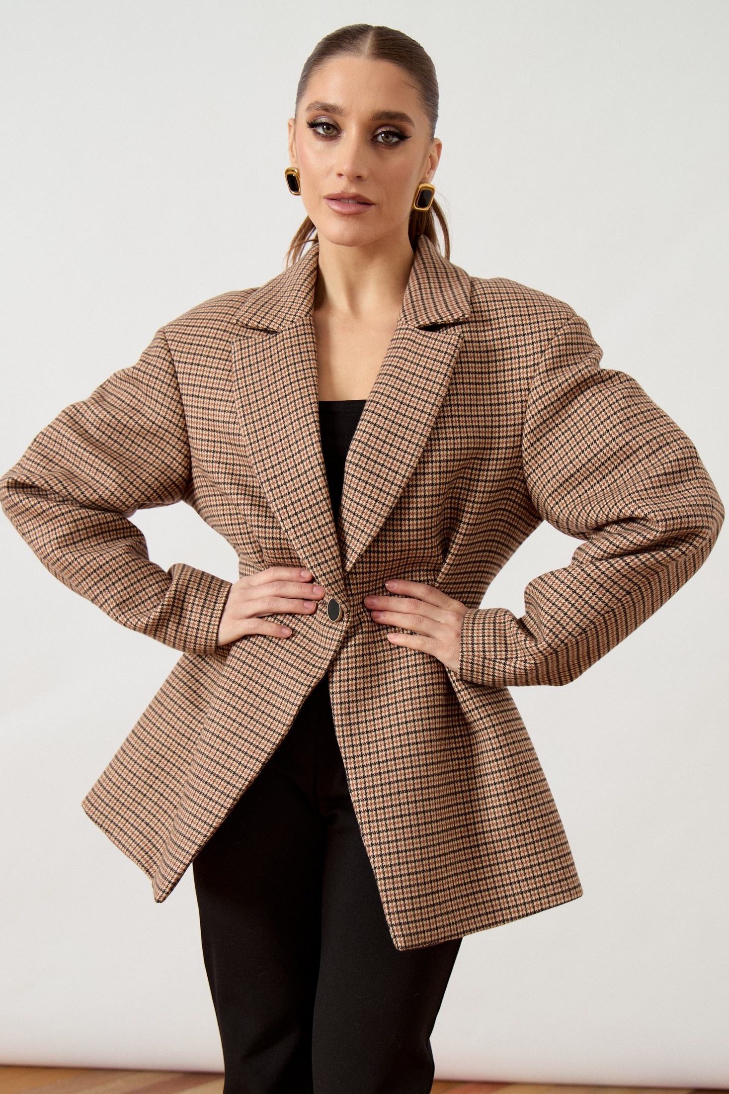 Модель А3507 Жакет приталенного силуэта выполнен из плотной костюмной ткани в мелкую клетку «пье-де-пуль» в коричнево-бежевых тонах, на притачной подкладке. Модель отличается объемным кроем в верхней части и акцентированной линией талии. Воротник классический пиджачного типа с прямоугольными лацканами. Центральная застежка на одну крупную пуговицу контрастного черного цвета. Передняя часть жакета оформлена глубокими мягкими складками, заложенными от линии талии, что создает эффект баски и подчеркивает женственность силуэта. Рукав втачной, длинный, с наполненной головкой и свободным прилеганием по всей длине. Спинка со средним швом и вертикальными рельефами. Нижний край изделия обработан классическим швом вподгиб