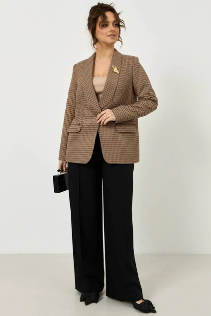 Жакет однобортный, прямого кроя. Жакет на подкладке, по бокам функциональные карманы. Жакет, выполнен из костюмной ткани, в мелкую клетку. На лацкане съемный декоративный элемент.