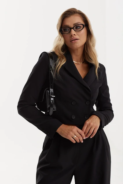 Жакет приталенный укороченный из костюмной ткани, на подкладке. Длина до линии талии. Застёжка центральная двубортная на петли-пуговицы. На левой полочке листочка с втачными краями на уровне груди (имитация кармана). Лацканы и воротник классической формы. Рукав втачной двухшовный с закрытой шлицей по локтевому шву и пуговицами внизу. Длина по спинке 46 см. Рост модели на фото 173 см.