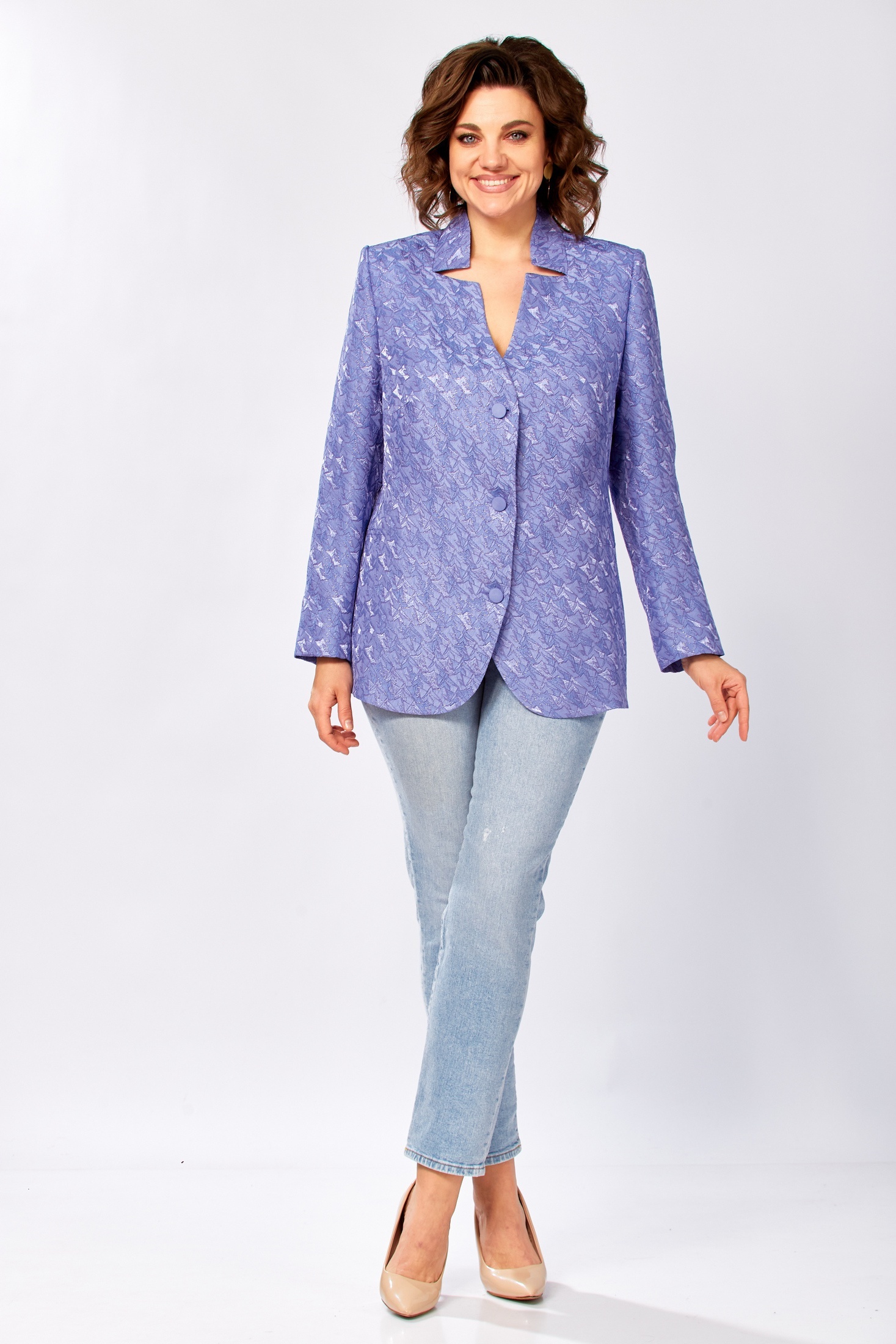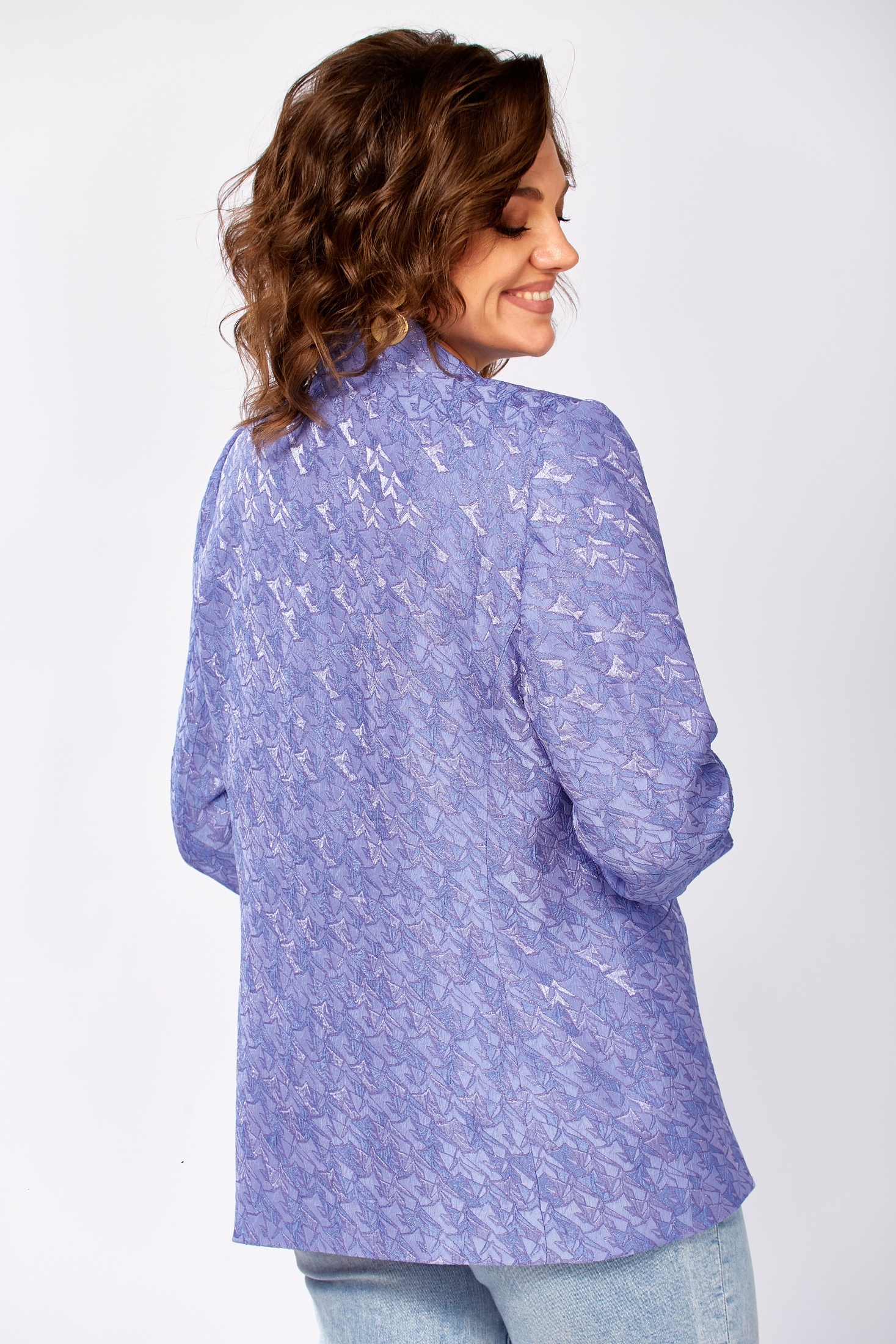 Жакет выполнен в благородном лавандовом оттенке с изысканным жаккардовым узором. Прямой силуэт подчеркивает современный стиль и элегантность. Классический воротник с эффектной фигурной линией придаёт образу выразительность. Модель дополнена крупными пуговицами, гармонирующими по цвету с основным тоном изделия. Лёгкий перелив ткани и оригинальный принт добавляют жакету особого шарма и свежести, делая эту вещь отличным выбором для стильного повседневного или делового гардероба.