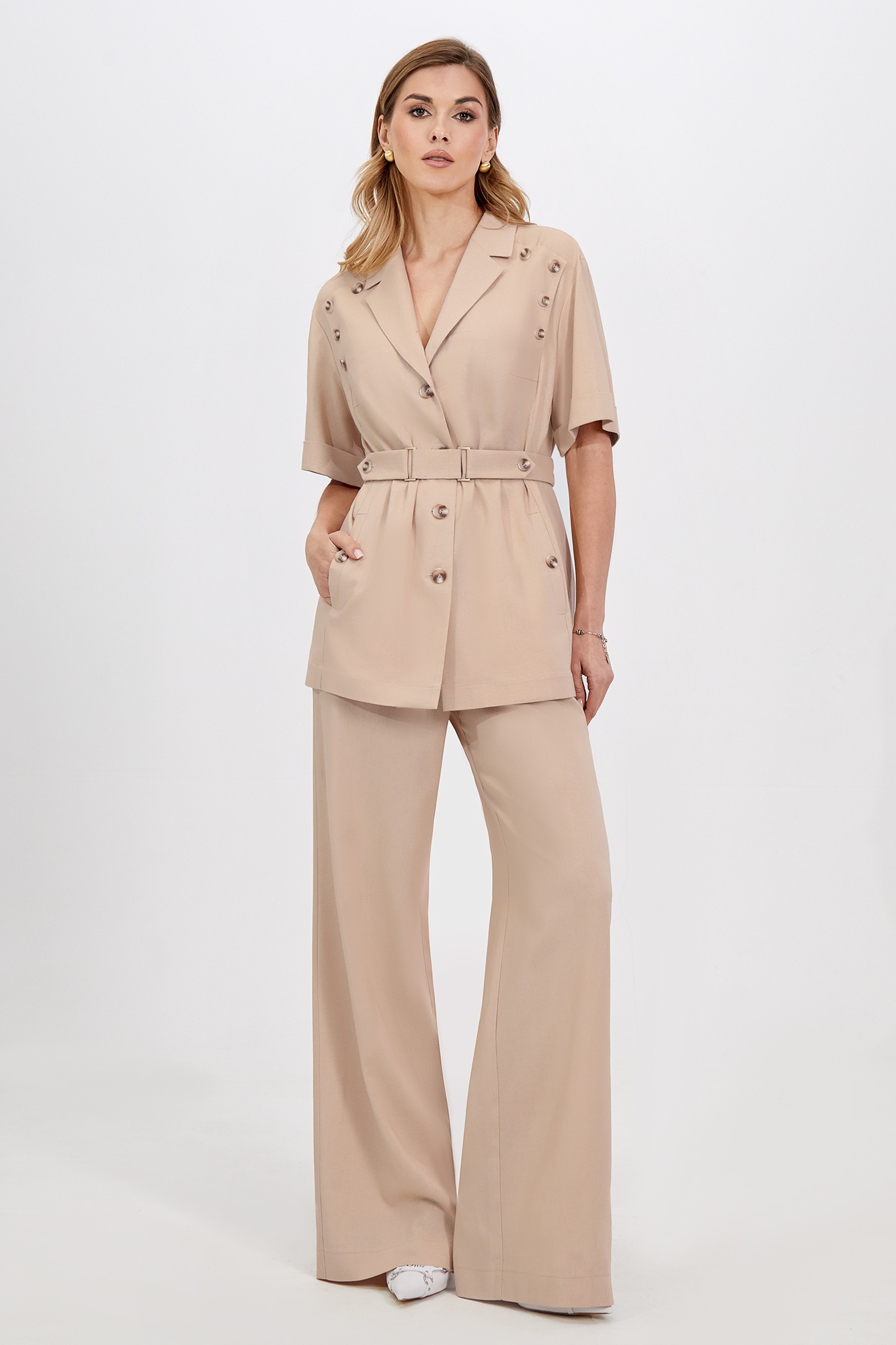 Жакет 5036 бежевый Bazalini сочетает в себе классические линии и современные тренды. Коллекция бренда Bazalini предлагает удлинённую модель, выполненную из смеси льна, вискозы и хлопка, обеспечивающей комфорт и легкость в ношении. Детали, такие как застёжка на пуговицы, два функциональных кармана и шлицы по спинке, добавляют практичности, а изысканные кокетки с пуговицами привлекают внимание. Короткие рукава с отложными манжетами, зафиксированные пуговицами, создают стильный акцент. Универсальный бежевый цвет и свободный силуэт делают жакет идеальным выбором для весны и лета, а комплектный пояс помогает подчеркнуть талию. Жакет отлично дополнит как повседневные, так и офисные образы.